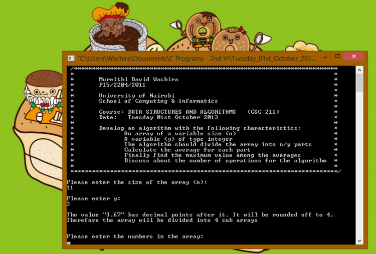 - printf(" /*************************************************************************\n * *\n * Mureithi David Wachira *\n * P15/2204/2011 *\n * *\n * University of Nairobi *\n * School of Computing & Informatics *\n * *\n * Course: DATA STRUCTURES AND ALGORITHMS (CSC 211) *\n * Date: Tuesday 01st October 2013 *\n * *\n * Develop an algorithm with the following characteristics: *\n * An array of a variable size (n) *\n * A variable (y) of type integer *\n * The algorithm should divide the array into n/y parts *\n * Calculate the average for each part *\n * Finally find the maximum value among the averages *\n * Discuss about the number of operations for the algorithm *\n * *\n **************************************************************************/\n ");