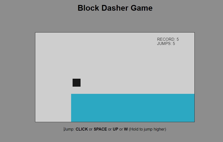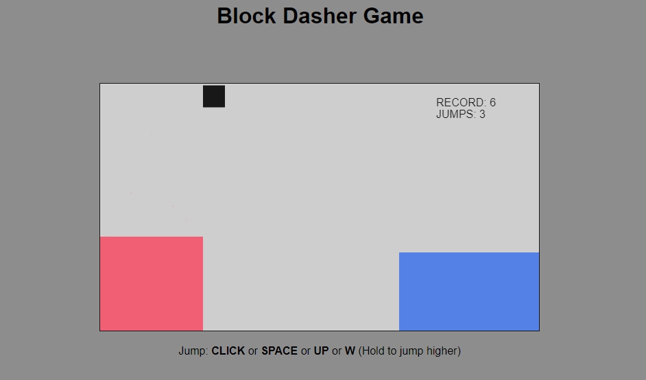 The Block Dasher Game is an interactive web application created using JavaScript with the help of the SketchJS library. This arcade-style game is highly engaging and fun to play, where the objective is to jump across platforms to earn a score. The Block Dasher Game in SketchJS is a score-based game where players must keep playing to achieve a higher score. It offers an enjoyable and immersive way to practice concepts such as game logic, randomization, and user interaction.