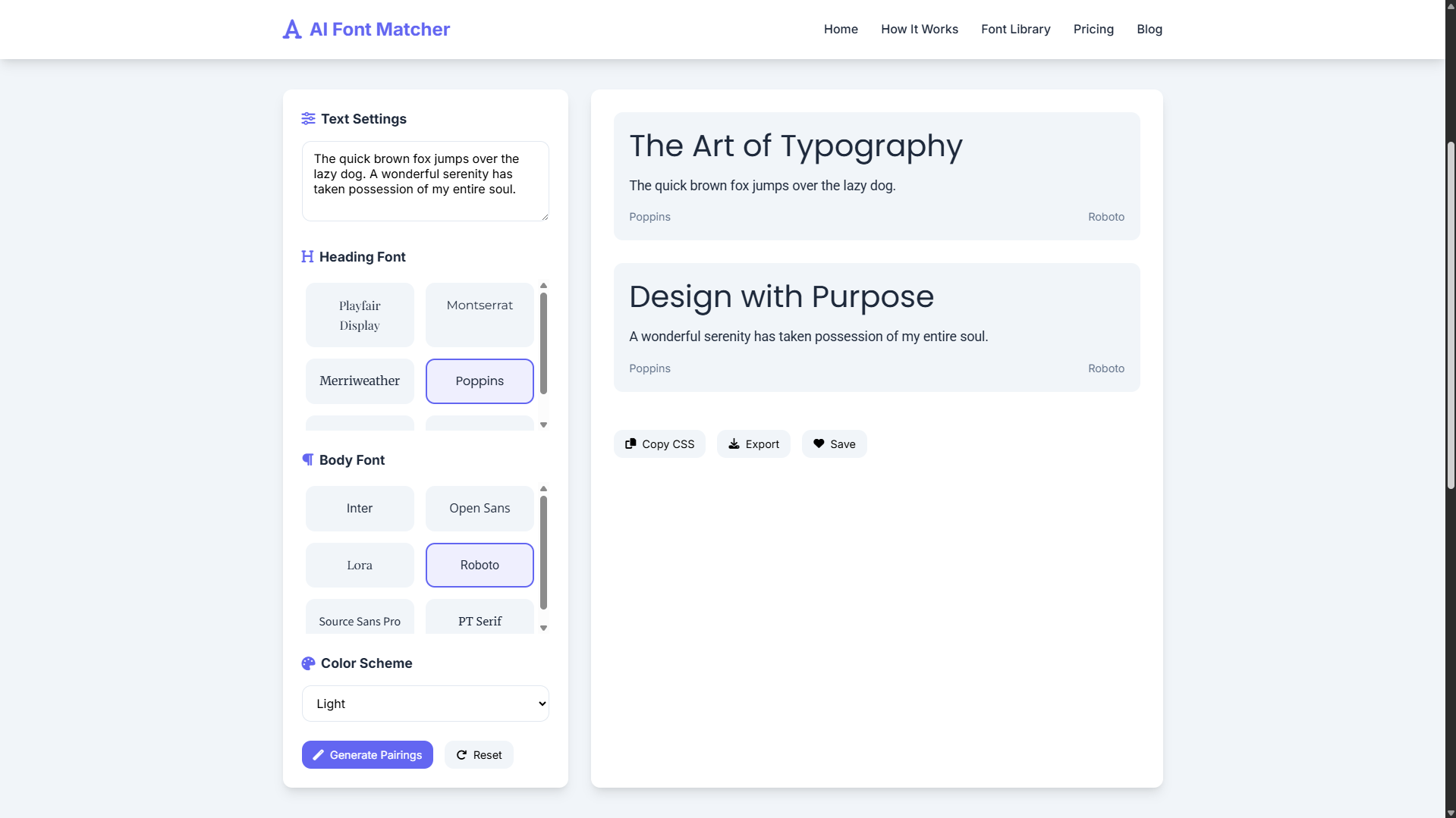 Click “Generate Pairings” to get AI-suggested font combinations