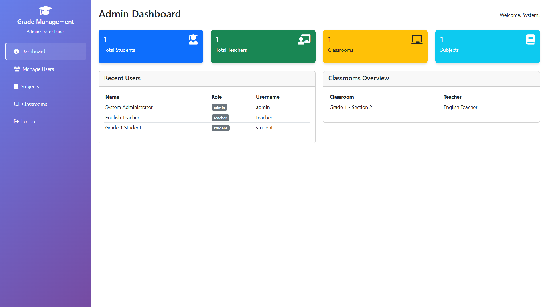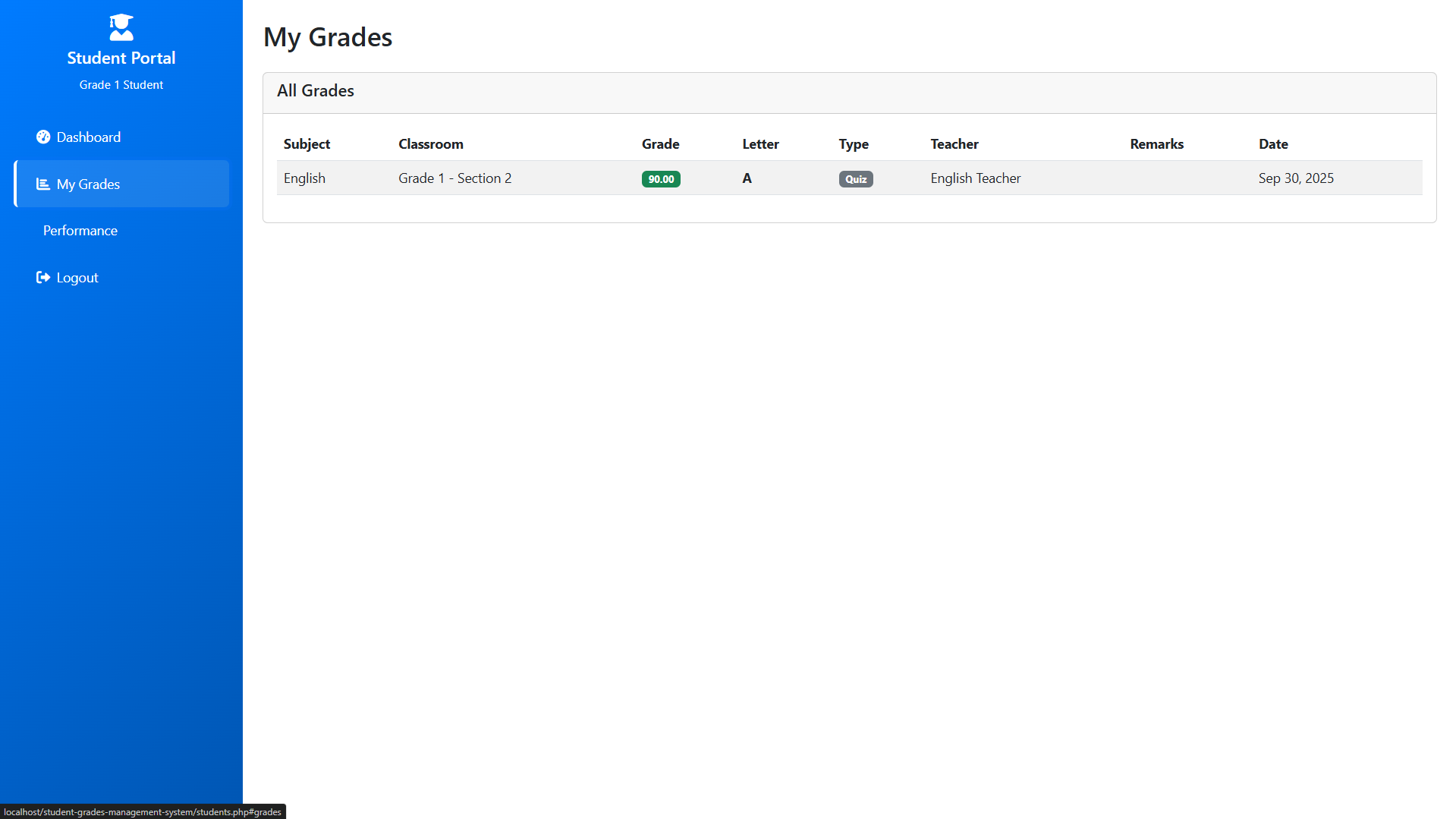 Welcome to the Student Grades Management System, a comprehensive web-based platform designed to revolutionize how educational institutions manage academic records and streamline grade administration. Built with modern PHP and MySQL technologies, our system provides a secure, efficient, and user-friendly environment for administrators, teachers, and students to collaborate effectively. Whether you're tracking student performance, managing classroom assignments, or monitoring academic progress, this robust solution offers all the tools necessary to maintain accurate records and foster educational excellence through organized, transparent grade management.