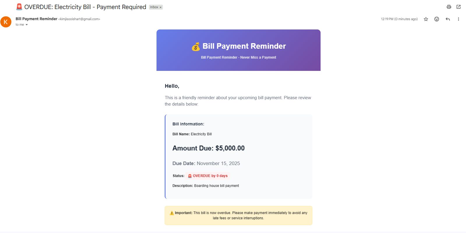 This powerful tool goes beyond simple tracking by incorporating automated email notifications that keep both you and your recipients informed about upcoming and overdue payments. With real-time status updates, visual indicators for payment urgency, and secure database operations, our system transforms how you handle bill management. Whether you're managing personal utilities, business invoices, or recurring subscriptions, this application offers the reliability and professionalism needed to maintain perfect payment records and strengthen your financial organization.