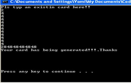 You can just use this in various banks and generate credit cards for customers. It generates cards using luhn's algorithm. You can compile it using GCC or Mingw. Anyone can use it.