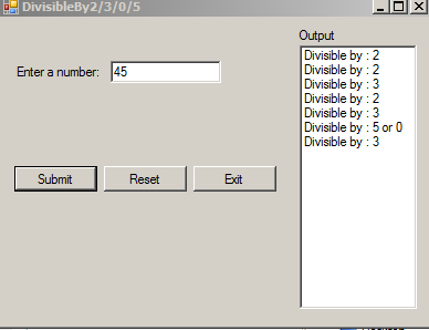 With the rules above, write a program that allow a user to enter a numeric value higher than 9 and less than 10,000 (maximum of 4 digits only) and will identify if that number is divisible by 2, 3 and/or 5.