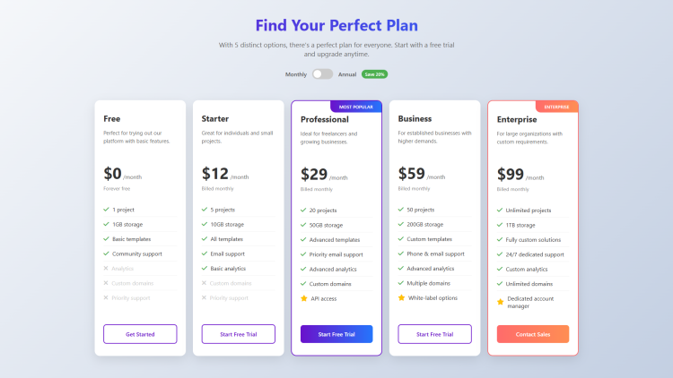 Welcome to Modern Pricing Cards, a sleek and interactive web component designed to showcase your service plans with elegance and functionality. This implementation features five distinct pricing tiers that cater to users at every stage, from free trial explorers to enterprise-level clients. With its clean design, smooth animations, and responsive layout, this pricing section provides an engaging user experience that helps visitors quickly compare options and make informed decisions.