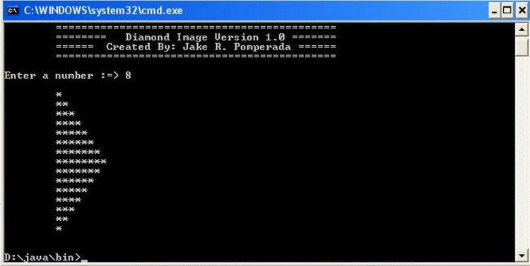 Hi there about this code I called it Diamond Image Version 1.0. It is a simple program that I wrote in Java to display a diamond image in different angle. It only use for loop statement to achieve the desired output.