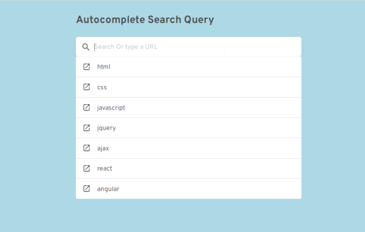 The Autocomplete Search Query is a web application created using the JavaScript programming language. This project provides a reliable search query that offers better information. The application suggests specific websites based on the inputs you provide in the textbox. The Autocomplete Search Query in VanillaJS is a project designed to help provide a website that ensures relevance to your search context. This project features a basic script coded purely in the JavaScript programming language.