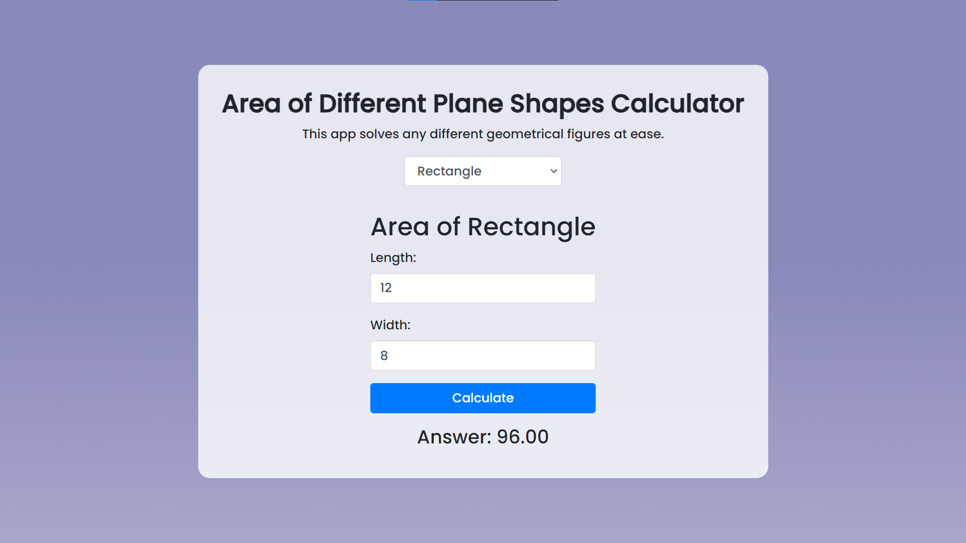 Welcome to the Area of Plane Shapes Calculator, a comprehensive tool designed to simplify geometric computations effortlessly. This web-based application leverages the power of HTML, CSS, and JavaScript to offer users an intuitive platform for determining the areas of various two-dimensional figures. With its user-friendly interface and real-time calculation capabilities, this calculator is tailored to meet the diverse needs of students, educators, and professionals alike.