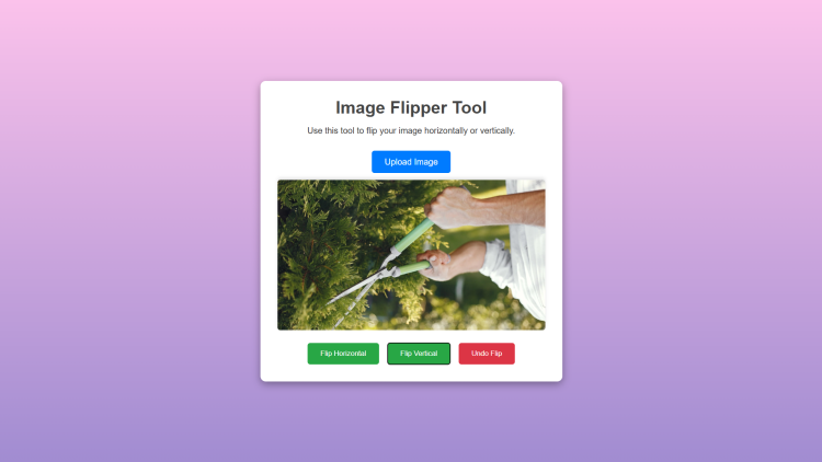 Built using HTML, CSS, and JavaScript, this tool provides smooth interactions with a visually appealing design. The flip functionality is achieved using CSS transformations, ensuring fast and efficient performance. To use the tool, simply upload an image, and the available controls will appear, allowing you to flip the image as needed. You can also undo the flip at any time to restore the original image. Enjoy a seamless and intuitive experience with the Image Flipper Tool!