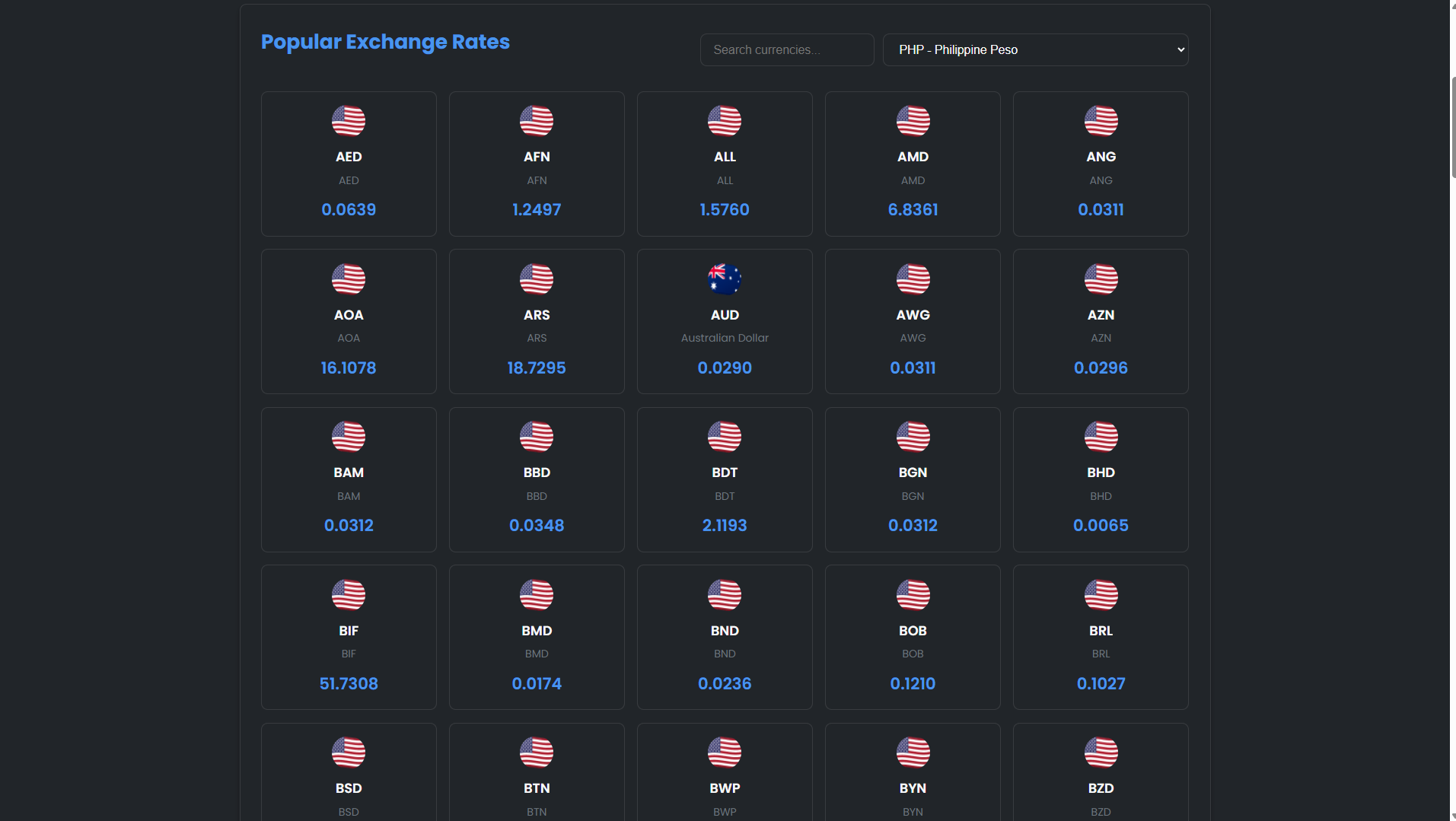 Explore the rate grid or use the search to find a specific currency.