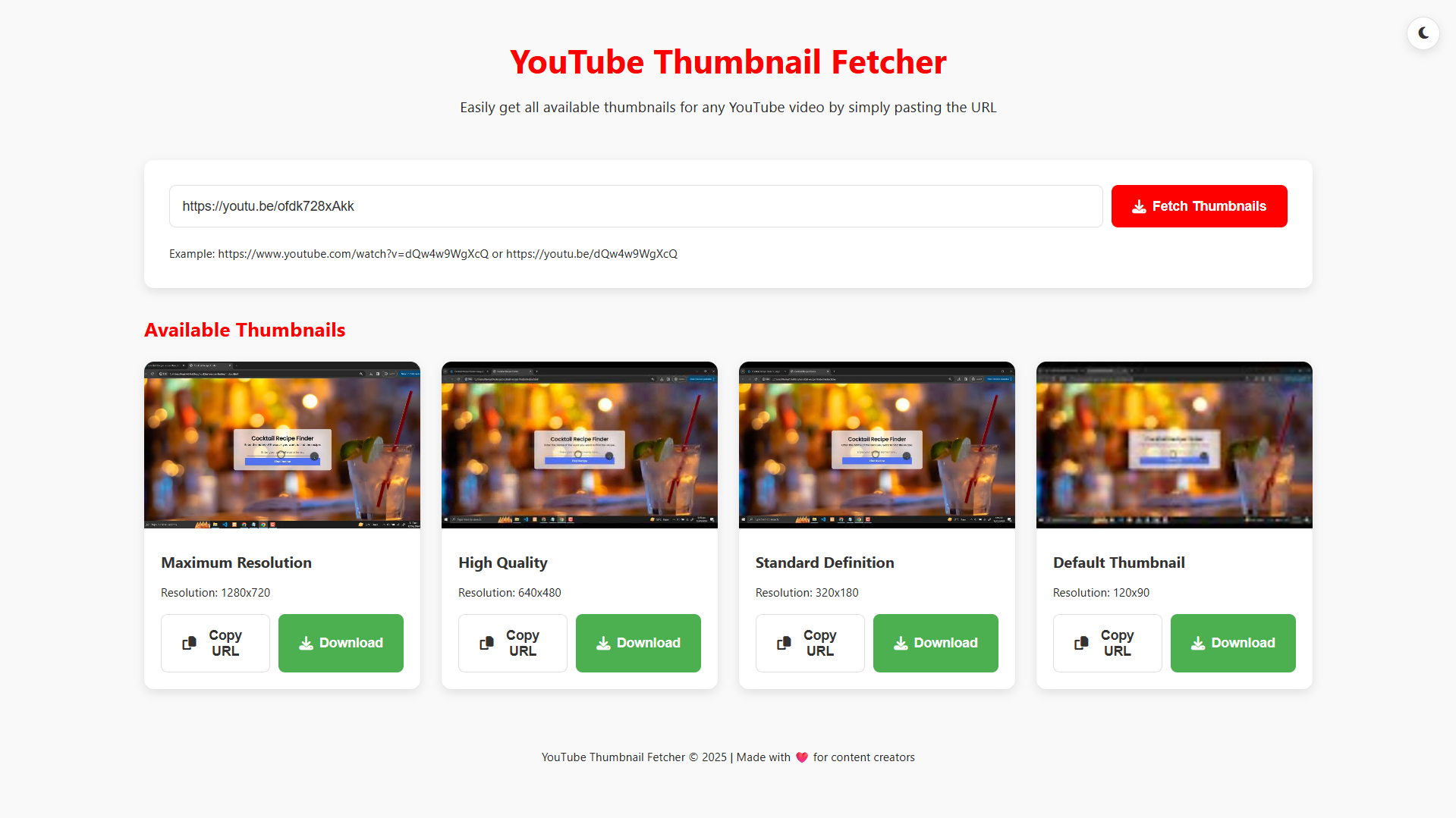 Experience seamless thumbnail extraction with features including multi-resolution support, one-click copying and downloading, interactive previews with zoom capability, and a responsive design that works flawlessly across all devices. The application boasts a sophisticated dark/light mode toggle for comfortable viewing in any lighting condition, along with intelligent URL validation and visual feedback systems. Built with HTML5, CSS3, and JavaScript, the YouTube Thumbnail Fetcher combines cutting-edge web technologies with user-centered design to deliver a professional-grade tool that's both powerful and accessible to users of all technical backgrounds.