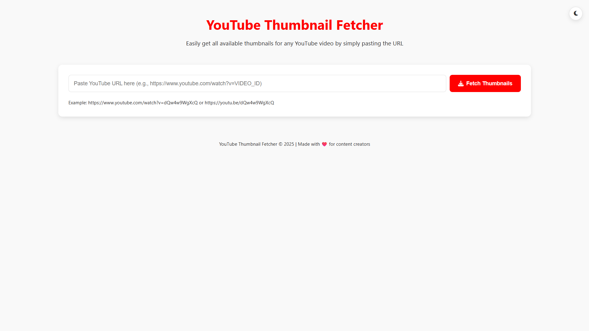 Welcome to the YouTube Thumbnail Fetcher, a powerful and intuitive web application designed to simplify the process of extracting high-quality thumbnails from any YouTube video. With its clean, modern interface and robust functionality, this tool eliminates the need for complicated screenshot methods or third-party browser extensions. Whether you're a content creator, marketer, or educator, our application provides instant access to all available thumbnail resolutions with just a simple URL paste, making it easier than ever to enhance your projects with perfect YouTube imagery.