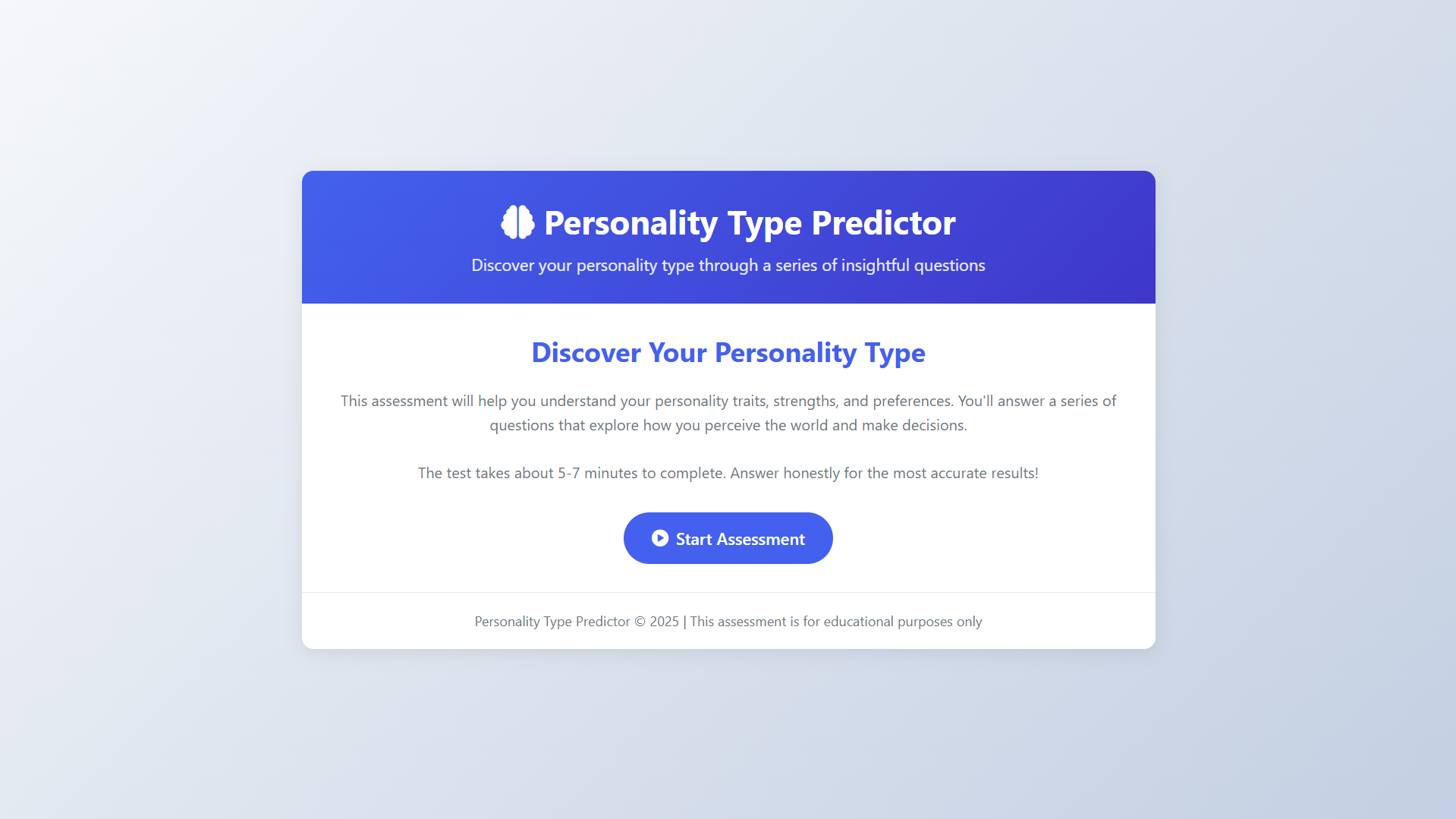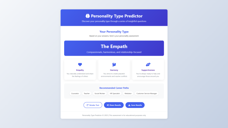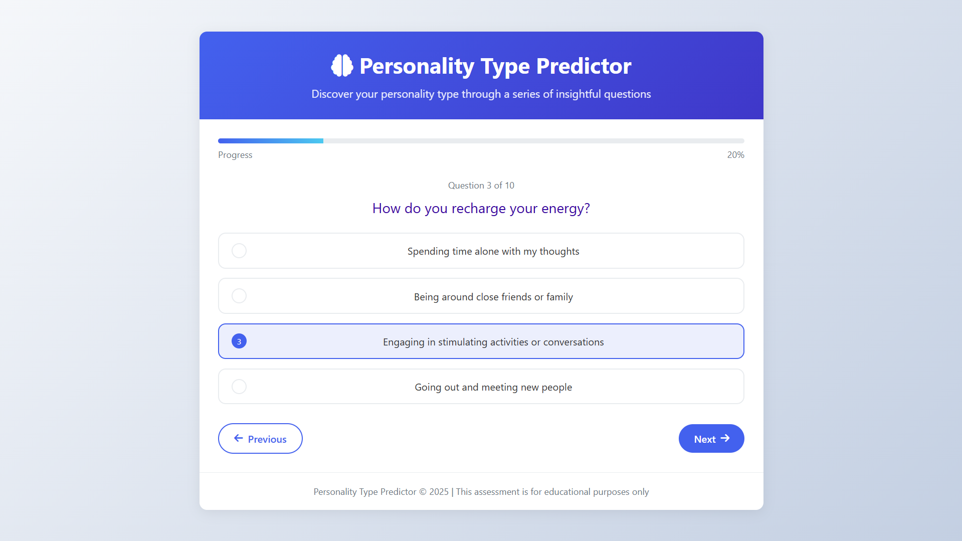 Welcome to the Personality Type Predictor, an interactive web application designed to help you discover and understand your unique personality traits. Through a carefully crafted series of psychological questions, this tool provides insightful analysis into your behavioral patterns, decision-making styles, and interpersonal dynamics. Whether you're looking to gain personal insight, improve your relationships, or explore career possibilities, this assessment offers valuable perspectives on what makes you uniquely you.