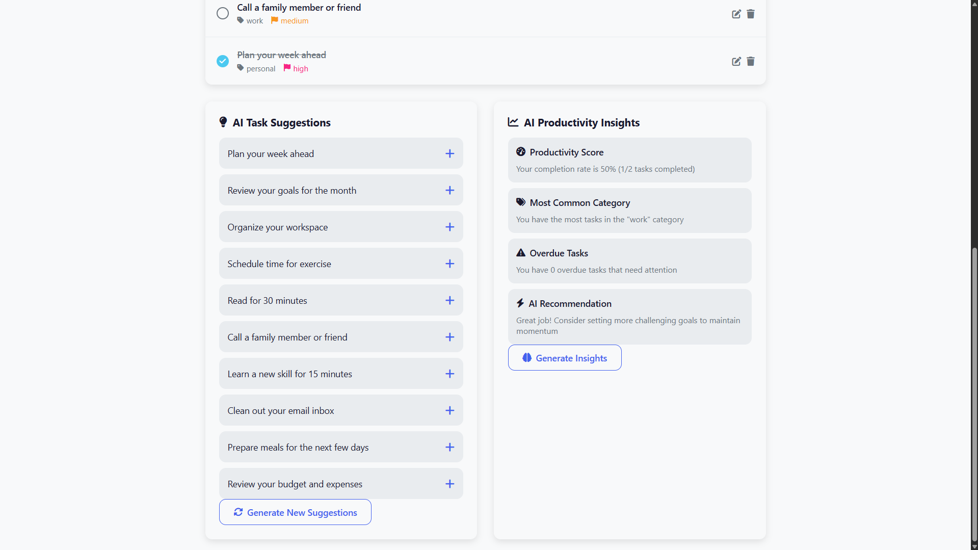 Add tasks manually or use the AI suggestions panel for common productivity tasks