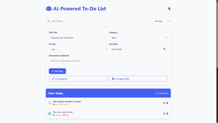 Welcome to the AI-Powered To-Do List App, your intelligent companion for modern task management. This innovative web application revolutionizes traditional to-do lists by integrating artificial intelligence capabilities that help you work smarter, not harder. Built with clean HTML, elegant CSS, and powerful JavaScript, this app offers a seamless, responsive experience across all your devices while keeping your data securely stored in your browser. Whether you're managing daily errands, work projects, or personal goals, our AI features provide smart suggestions and insights to enhance your productivity and keep you organized in style.