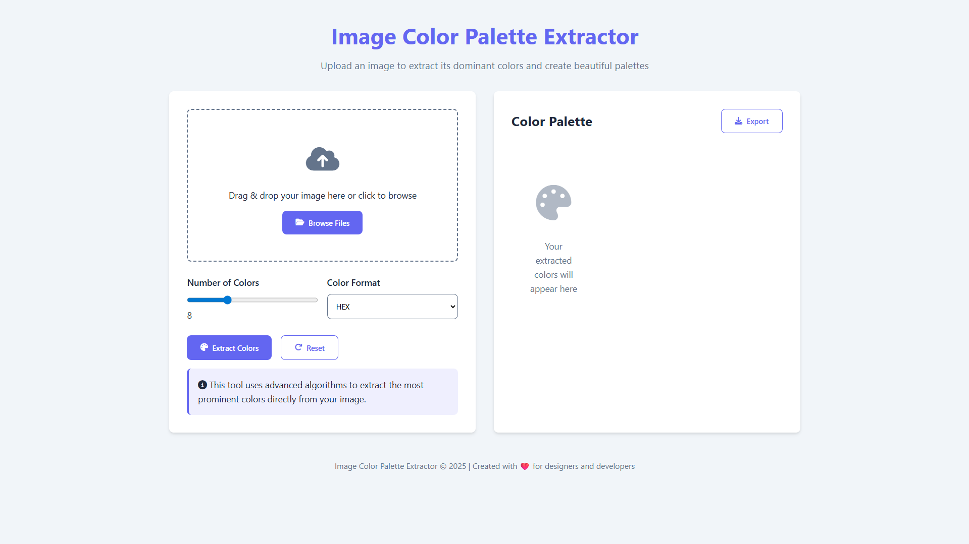 Using advanced color detection algorithms, the application analyzes your uploaded images directly in the browser—no server uploads required—ensuring both privacy and rapid results. The clean, modern interface features drag-and-drop functionality, customizable palette sizes, and one-click copying for seamless integration into your workflow. Simply upload your image, adjust your preferences, and let the Image Color Palette Extractor do the rest, turning your visuals into professional color palettes ready for your next project.