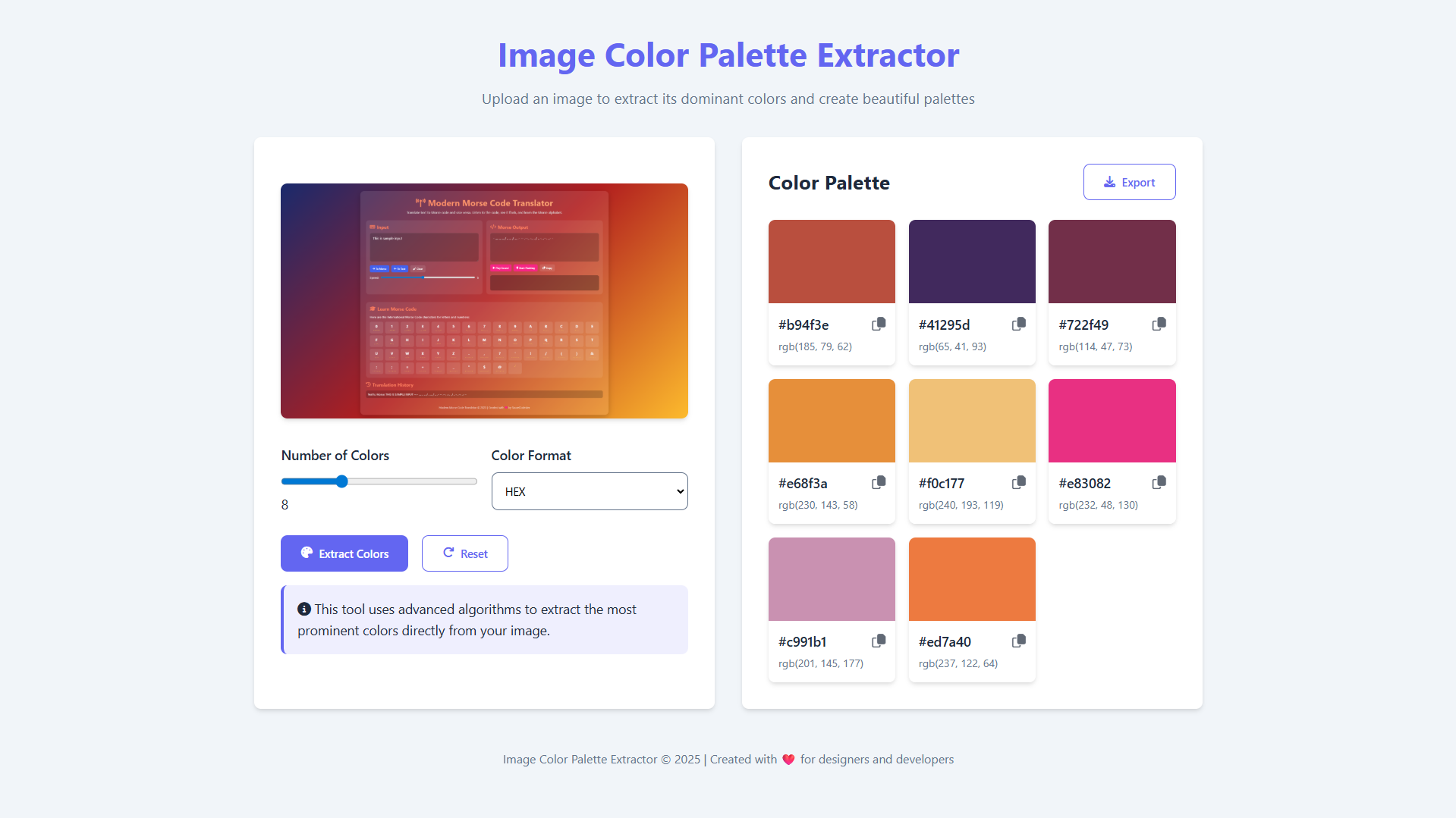 Welcome to the Image Color Palette Extractor, a powerful web application designed to transform your visual inspiration into actionable color schemes. This intuitive tool allows designers, developers, and creatives to upload any image and instantly extract its dominant color palette, providing accurate HEX, RGB, and HSL values for each color. Whether you're building a website, creating digital art, or developing a brand identity, our application helps you capture the perfect color combinations directly from your source imagery.