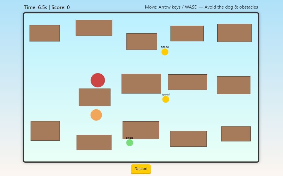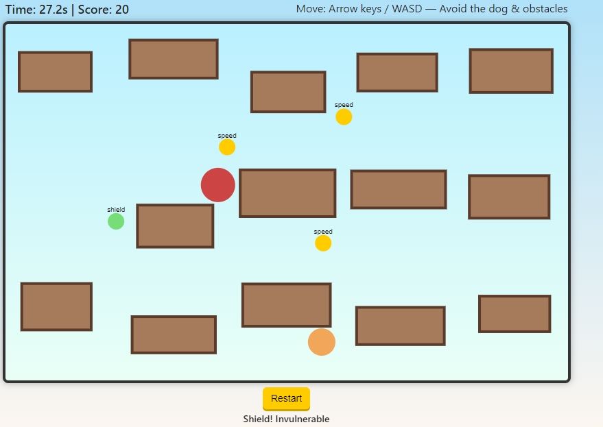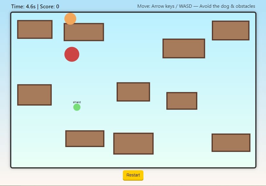 The Chase Game is an interactive web application built entirely with JavaScript. The gameplay is simple—the player must keep running while avoiding being caught by the dog. The Chase Game Using JavaScript offers a fun and challenging experience, where you can collect items for boosts while trying to escape. This project also provides an excellent opportunity to practice and reinforce essential programming concepts while enhancing your JavaScript skills in game development.