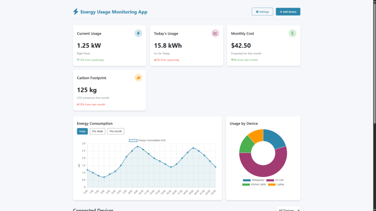 Welcome to the Energy Usage Monitoring App, your comprehensive solution for tracking and managing household electricity consumption. This intuitive web application provides real-time insights into your energy usage patterns, helping you make informed decisions to reduce costs and minimize environmental impact. With its clean, modern interface and powerful visualization tools, our monitor transforms complex energy data into easily understandable information that empowers you to take control of your power consumption.