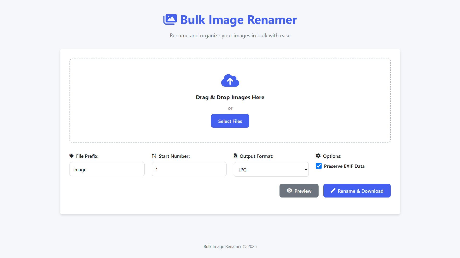 Welcome to the Bulk Image Renamer, a powerful and intuitive web application designed to simplify your digital workflow. This tool eliminates the tedious task of manually renaming image files one by one, providing an efficient solution for photographers, content creators, and anyone working with large collections of digital images. Built with modern web technologies, our application offers a seamless experience that combines robust functionality with an elegant, user-friendly interface that works perfectly on both desktop and mobile devices.