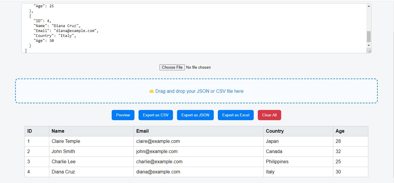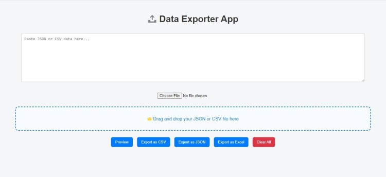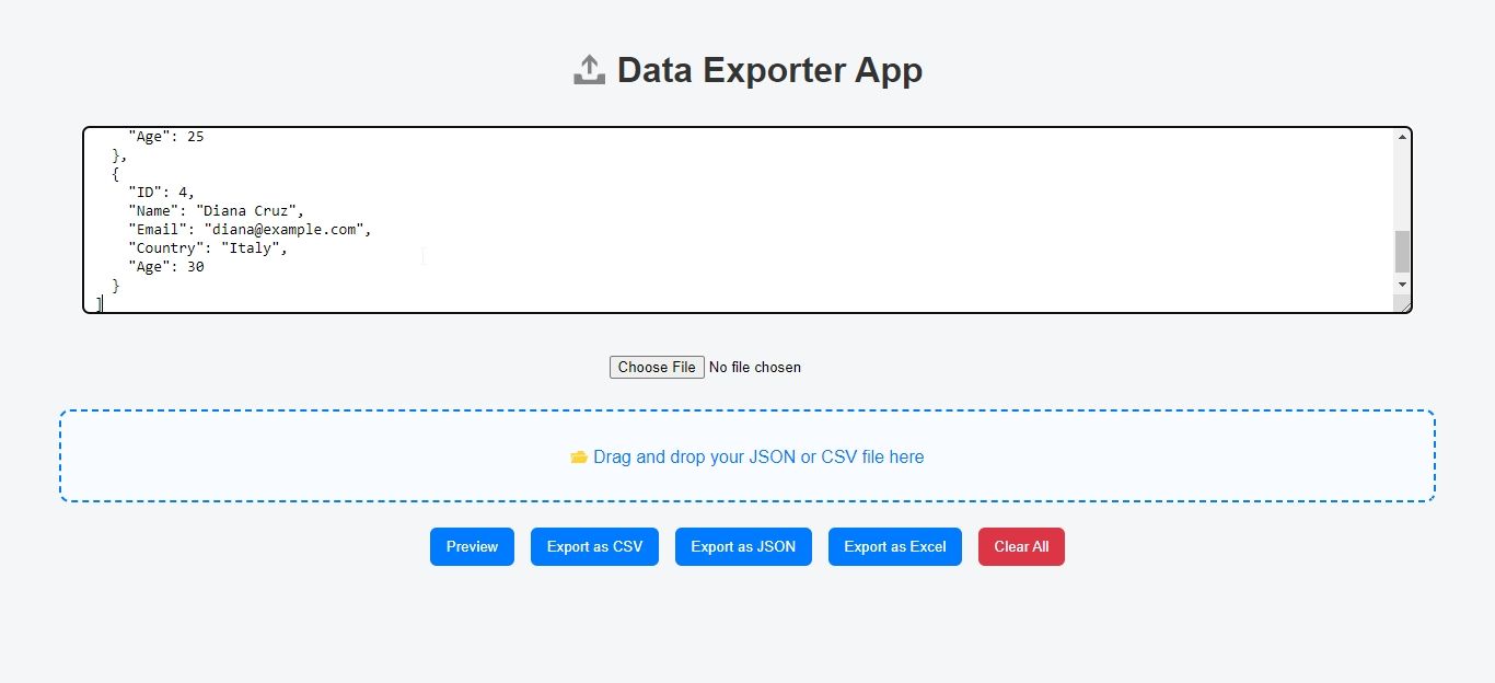 The Data Exporter App Using JavaScript is an interactive and user-friendly web application designed to simplify data handling and file conversion tasks directly in the browser. Built using HTML, CSS, and JavaScript, this app enables users to easily upload files through a drag-and-drop interface or manual selection, automatically preview the data, and export it into different formats such as JSON or CSV. The auto-preview feature provides a clear visual representation of the uploaded data, helping users verify its structure before exporting. Additionally, the Clear All function allows for quick workspace resets, ensuring smooth operation and an efficient workflow. This project is ideal for learners and developers who want to understand file processing, data manipulation, and export functionalities using client-side JavaScript, while also exploring how to create responsive and practical data management tools for web applications.