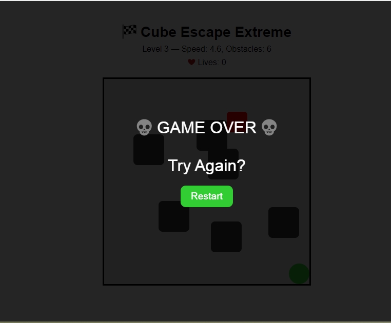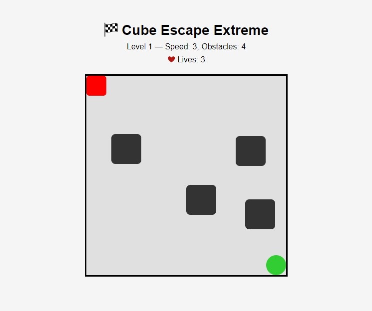 The Cube Escape Extreme Game is an interactive web application built entirely with JavaScript. The gameplay is simple — the player’s goal is to reach the green orb while avoiding obstacles. Each level becomes progressively more difficult, increasing the challenge. The Cube Escape Extreme Game Using JavaScript offers a fun and engaging experience where the player loses a life upon hitting an obstacle. This project is an excellent opportunity to practice and reinforce essential programming concepts while improving your JavaScript skills in game development.