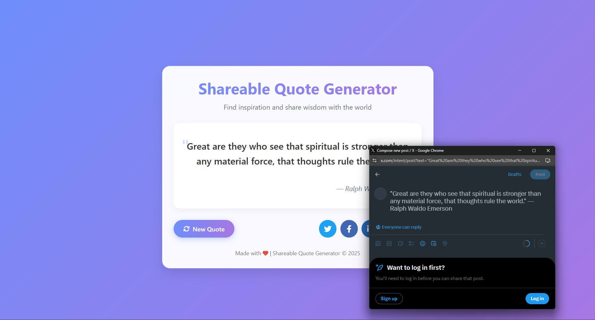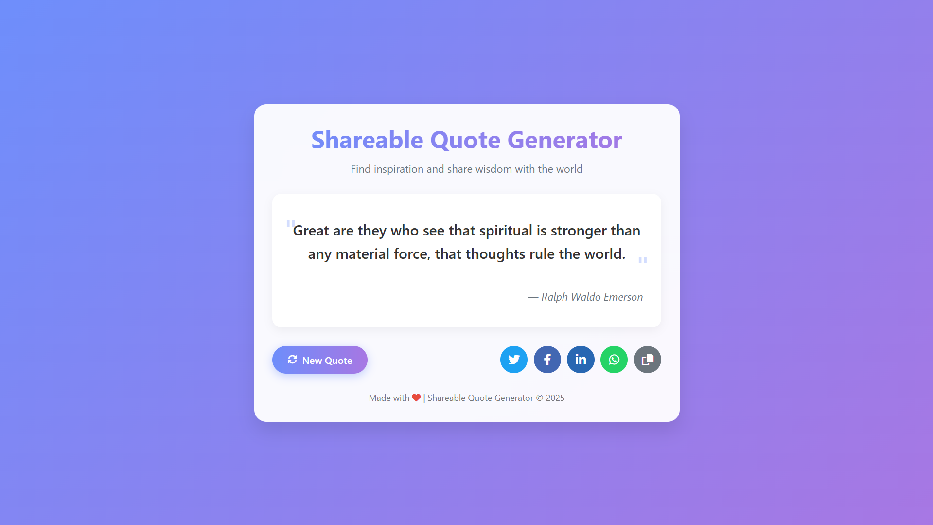 In conclusion, the Shareable Quote Generator beautifully demonstrates how modern web technologies can create engaging and practical digital experiences. It provides users with a source of daily inspiration while offering seamless sharing capabilities across social networks — all within a single, elegantly designed interface.