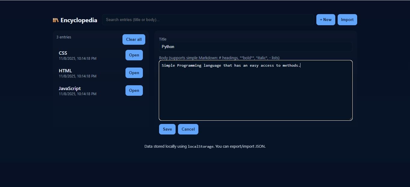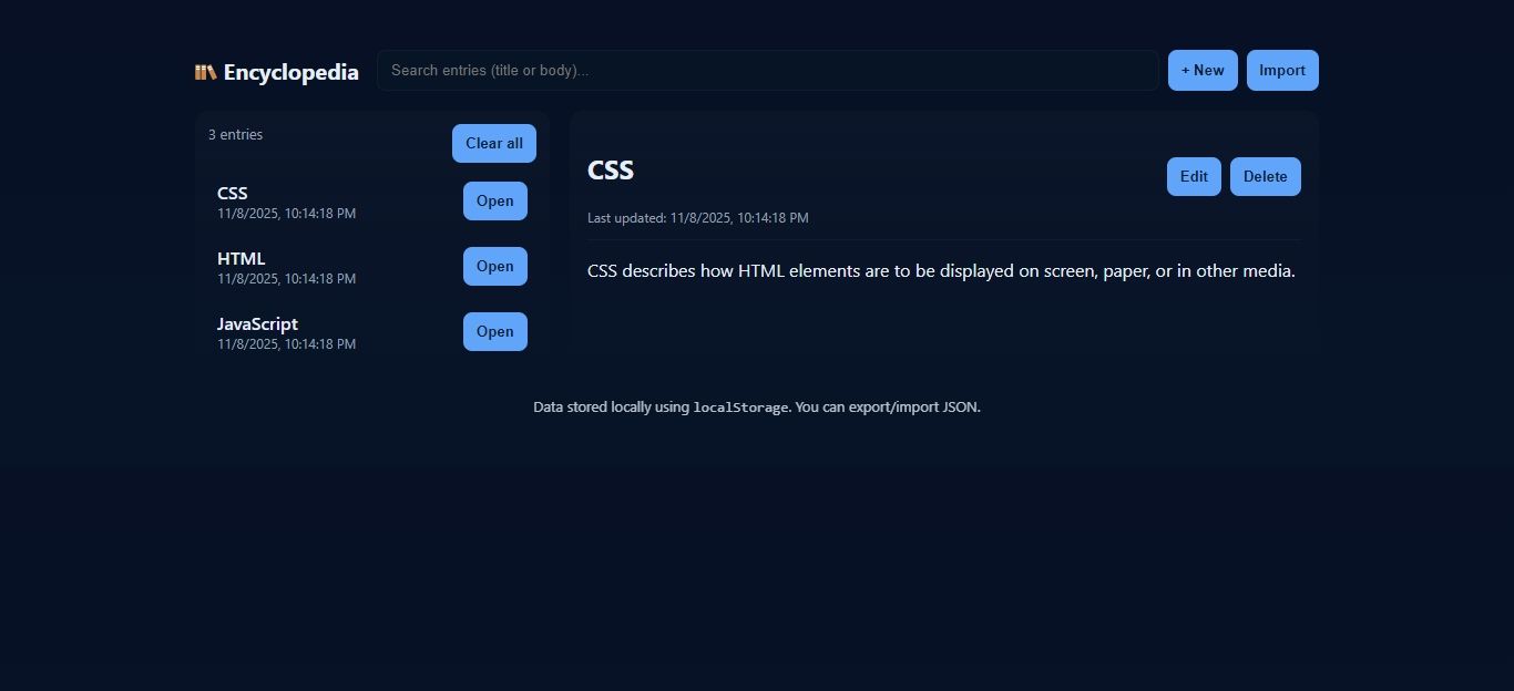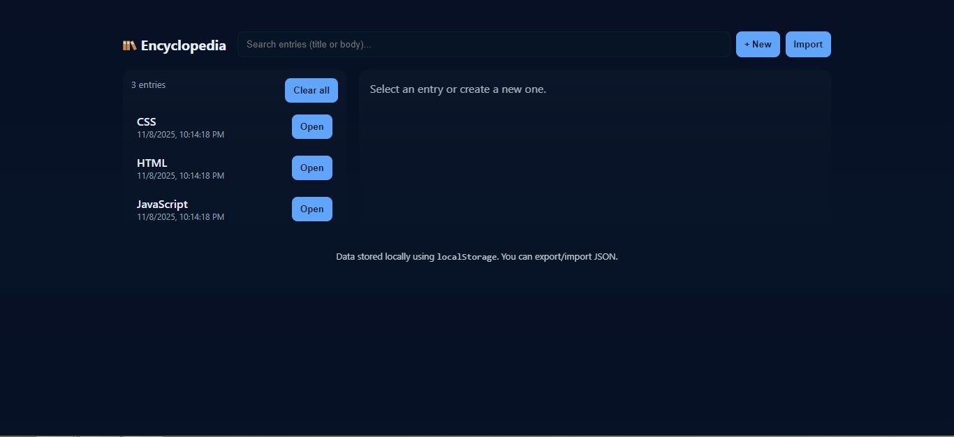 The Encyclopedia App Using VanillaJS is a lightweight and interactive web application built entirely with HTML, CSS, and JavaScript, without relying on any frameworks. It allows users to explore, search, and post articles, simulating the core functionality of an online encyclopedia. The app features a clean and intuitive interface where users can easily navigate through different entries, find information quickly, and contribute new content. This project is an excellent opportunity for beginners to strengthen their skills in DOM manipulation, event handling, and implementing basic CRUD (Create, Read, Update, Delete) operations. Additionally, it provides practical experience in structuring a functional web application and enhancing user interaction using only VanillaJS.