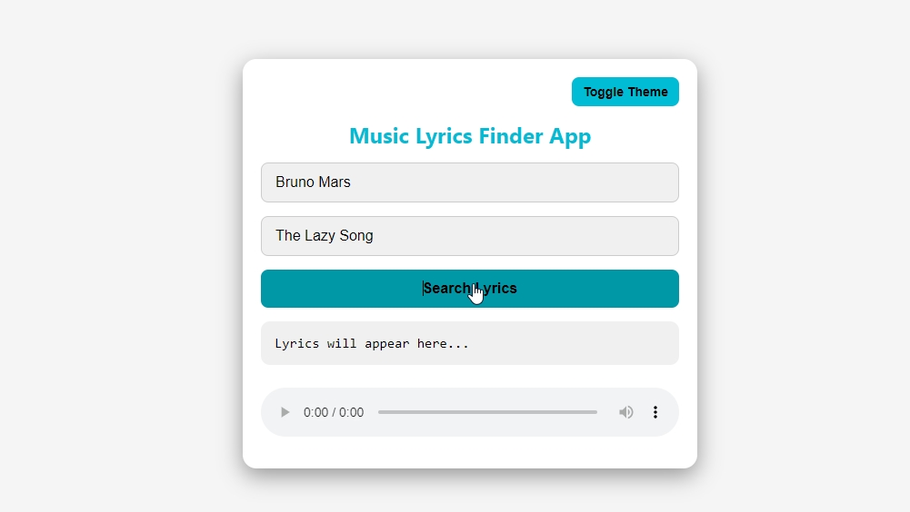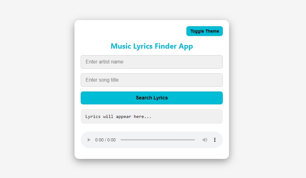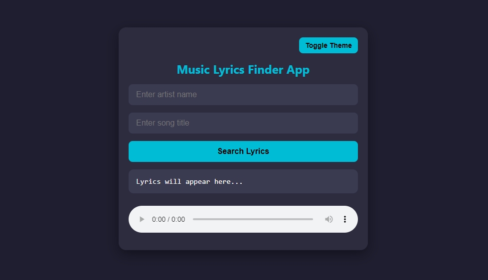 The Music Lyrics Finder App Using VanillaJS is a simple yet powerful web application designed to help users quickly find the lyrics of their favorite songs. Built entirely with VanillaJS, the app allows users to enter the artist's name and song title, then fetches the corresponding lyrics from an online API in real-time. The interface is clean and user-friendly, ensuring that users can access the lyrics without any distractions. Beyond its practical use, the project serves as an excellent learning opportunity for beginners and intermediate developers to strengthen their skills in DOM manipulation, event handling, and working with asynchronous JavaScript. Additionally, it demonstrates how to integrate external APIs, handle user input efficiently, and display dynamic content on a web page, making it both a functional tool and a valuable educational project.