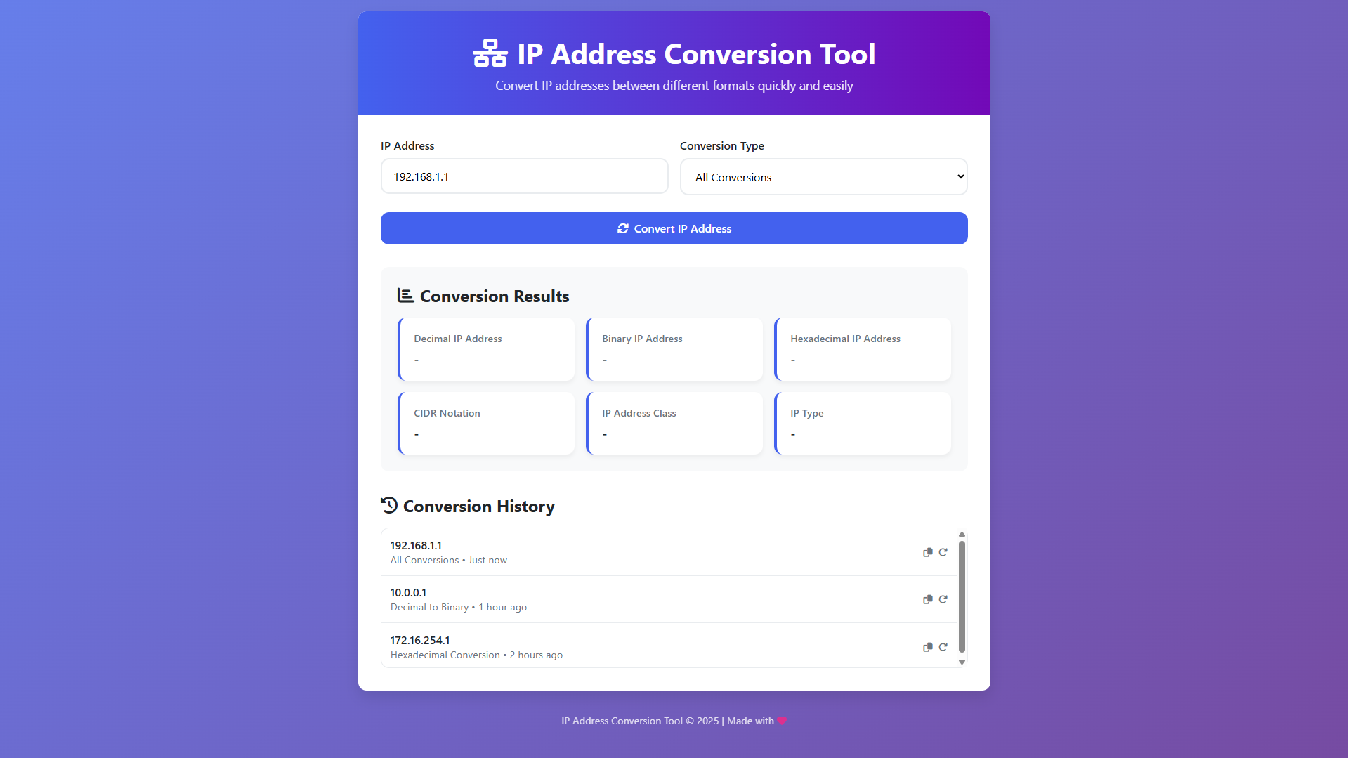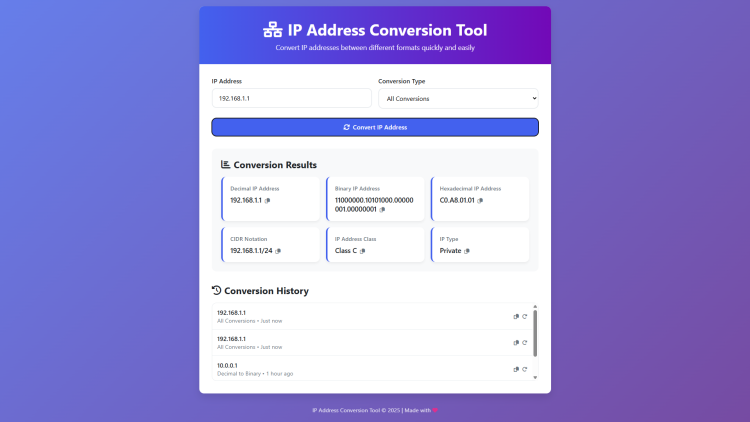 Welcome to the IP Address Conversion Tool, your comprehensive solution for all IP address conversion needs. This powerful web application is specifically designed for network administrators, developers, and IT professionals who require quick and accurate IP address transformations. Whether you're configuring network settings, troubleshooting connectivity issues, or working on software development projects, our tool provides an intuitive interface to seamlessly convert between decimal, binary, hexadecimal, and CIDR notation formats. The application eliminates the complexity of manual calculations while ensuring precision and efficiency in your daily workflow.