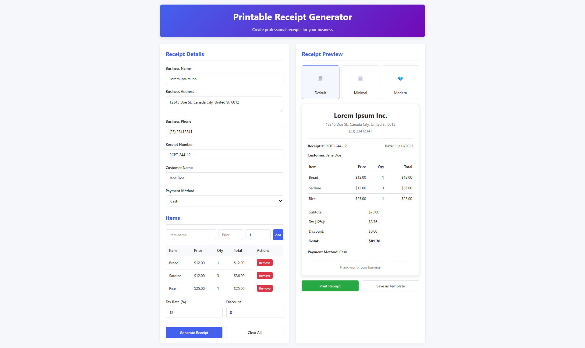 With its responsive design and robust feature set, the Printable Receipt Generator eliminates the hassle of manual receipt creation. You can easily input business details, add line items, apply taxes and discounts, and choose from multiple payment methods—all while seeing a live preview of your receipt. The application also includes template options and automatic data saving, making it a reliable tool for repeated use. Say goodbye to clunky templates and hello to a streamlined, professional approach for all your receipt needs.