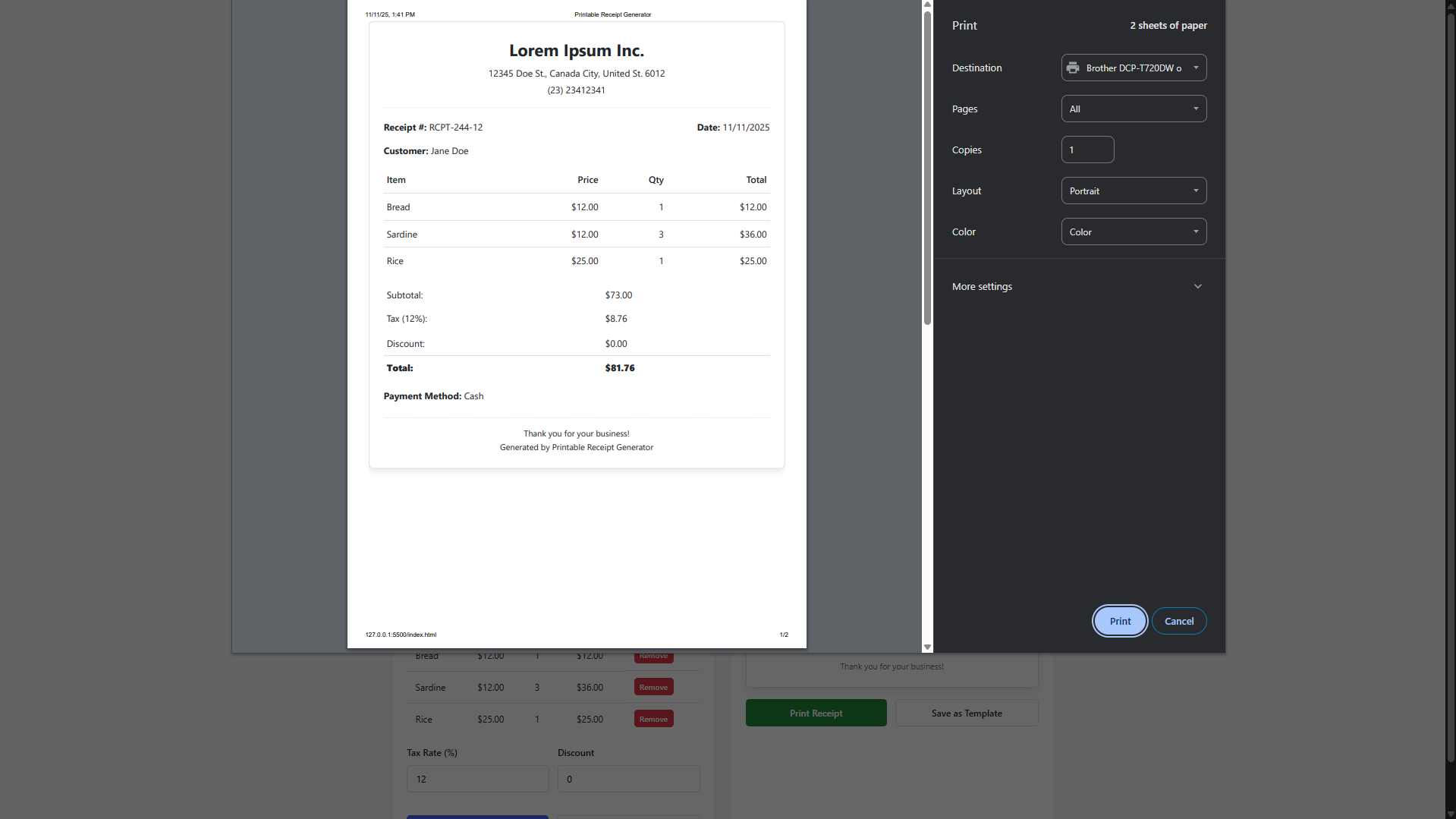 Printable Receipt Generator Using HTML, CSS and JavaScript with Source Code