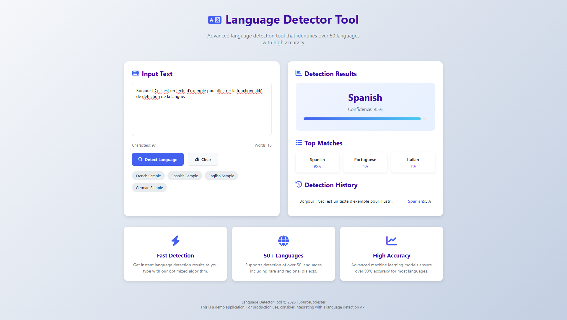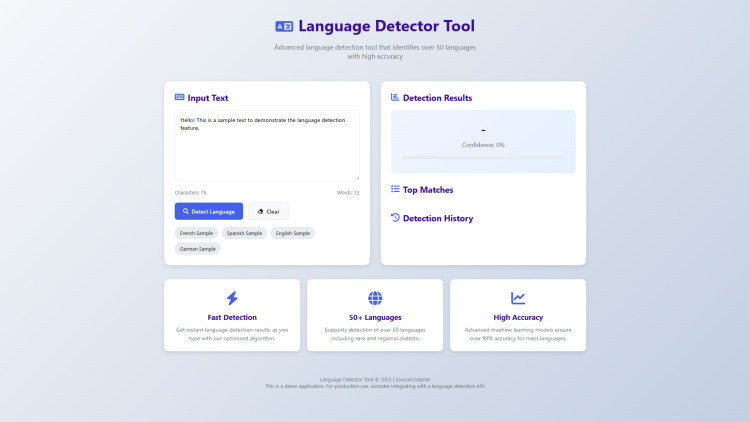 Built with modern web technologies including HTML5, CSS3, and vanilla JavaScript, this application features a responsive, visually appealing design that works seamlessly across all devices. The clean, user-friendly interface presents detection results through interactive visual elements, including confidence bars, language cards, and historical tracking, transforming complex language analysis into a straightforward, engaging experience. With additional features like sample text libraries, real-time statistics, and one-click functionality, the Language Detector Tool represents the perfect blend of sophisticated technology and practical usability for all your language identification needs.