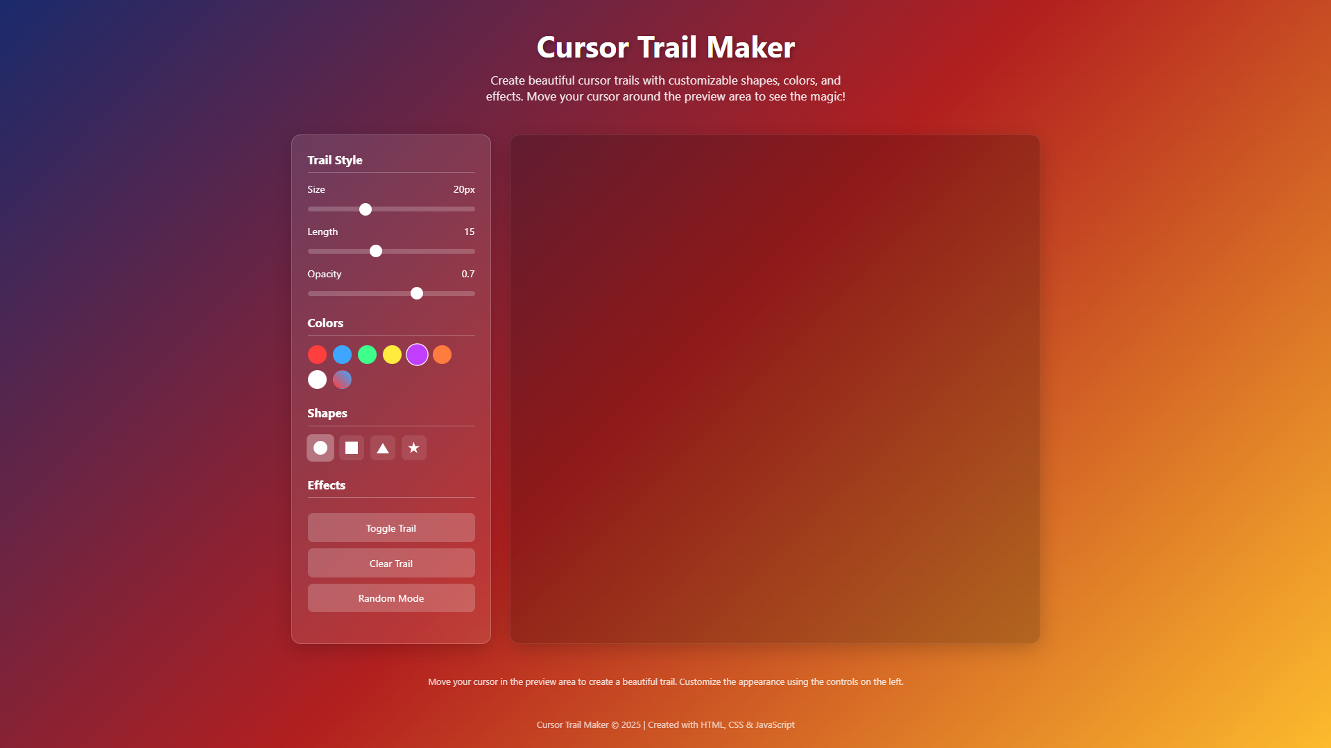 The application features a comprehensive set of customization options that put you in complete control of your visual journey. You can experiment with various shapes including circles, squares, triangles, and stars, choose from a vibrant color palette with gradient options, and adjust parameters like size, length, and opacity to create your perfect trail effect. With additional features like random mode for unexpected variations and instant toggle controls, the Cursor Trail Maker provides endless possibilities for personalization. The clean, modern interface ensures that both technical and non-technical users can easily navigate the options and immediately see their changes in real-time, making digital creativity accessible to everyone.