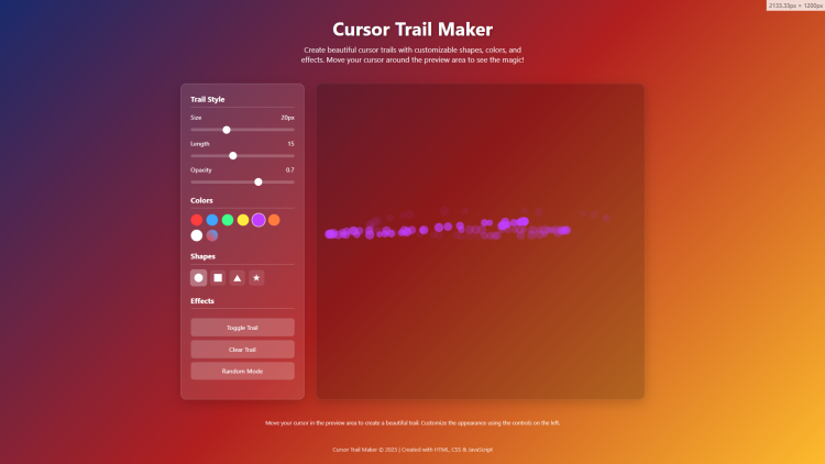 Welcome to the Cursor Trail Maker, an interactive web application that transforms your ordinary cursor movements into a captivating visual experience. This innovative tool allows you to create beautiful, dynamic trails that follow your cursor across the screen, turning simple navigation into an artistic display. Built with modern web technologies, this application combines functionality with creative expression, providing users with a seamless and engaging way to customize their digital interaction. Whether you're looking to add flair to your presentations or simply want to enjoy a more visually stimulating computing experience, the Cursor Trail Maker offers an intuitive platform for bringing your cursor to life.