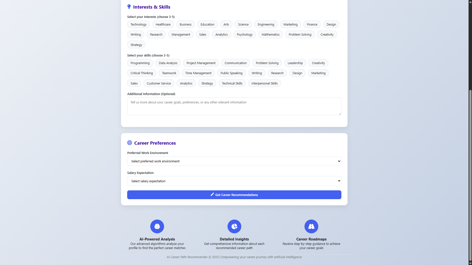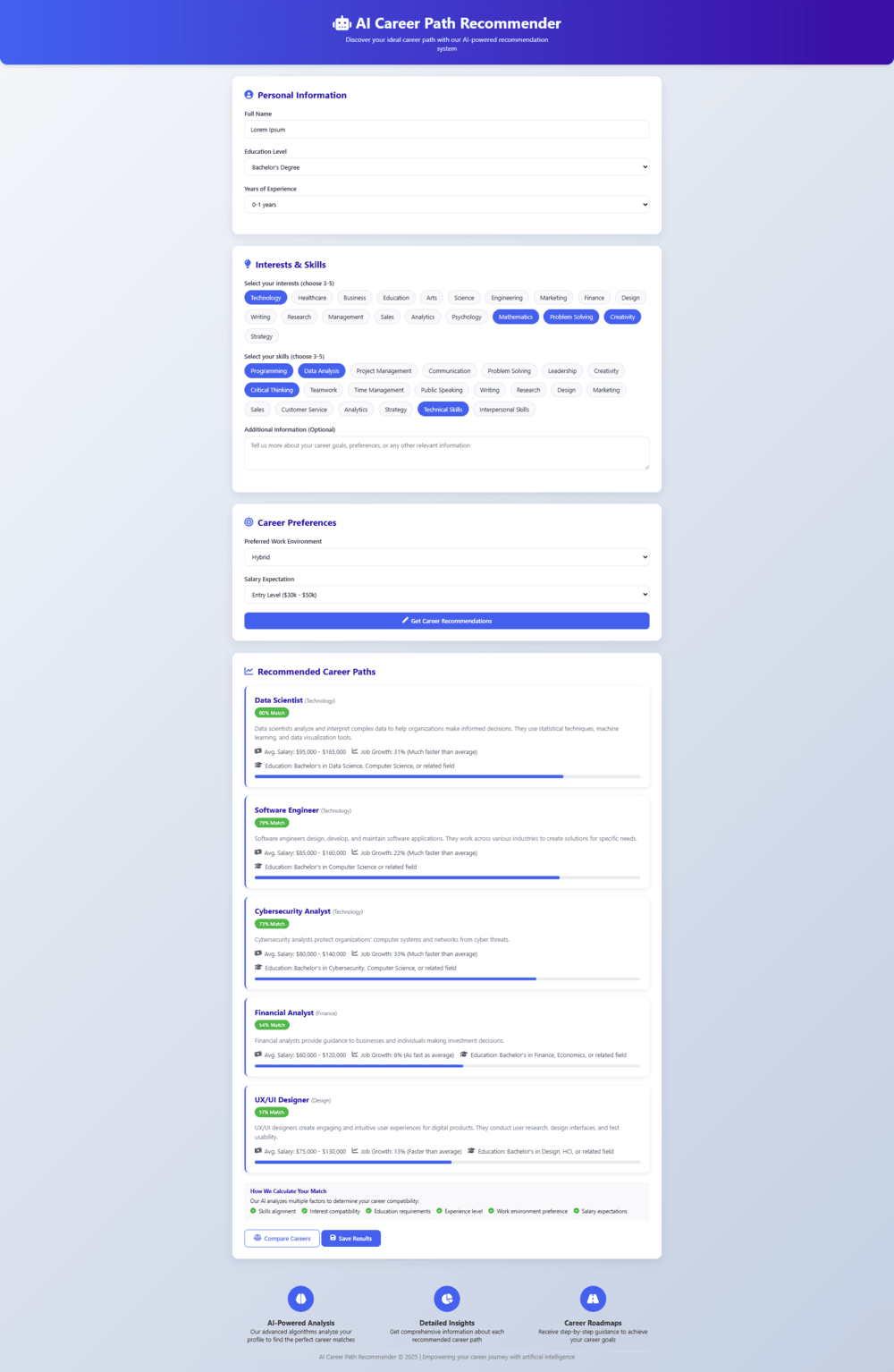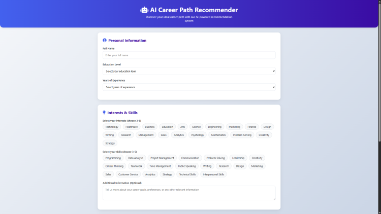 Welcome to the AI Career Path Recommender, an innovative web application designed to elevate your career exploration journey. This intelligent platform leverages the power of artificial intelligence to analyze your unique profile—your skills, interests, education, and professional preferences—to deliver highly personalized career recommendations. Whether you’re a student planning your future, a professional exploring a career shift, or someone simply curious about new opportunities, our advanced matching algorithm provides data-driven insights to guide your decisions with accuracy and clarity.
