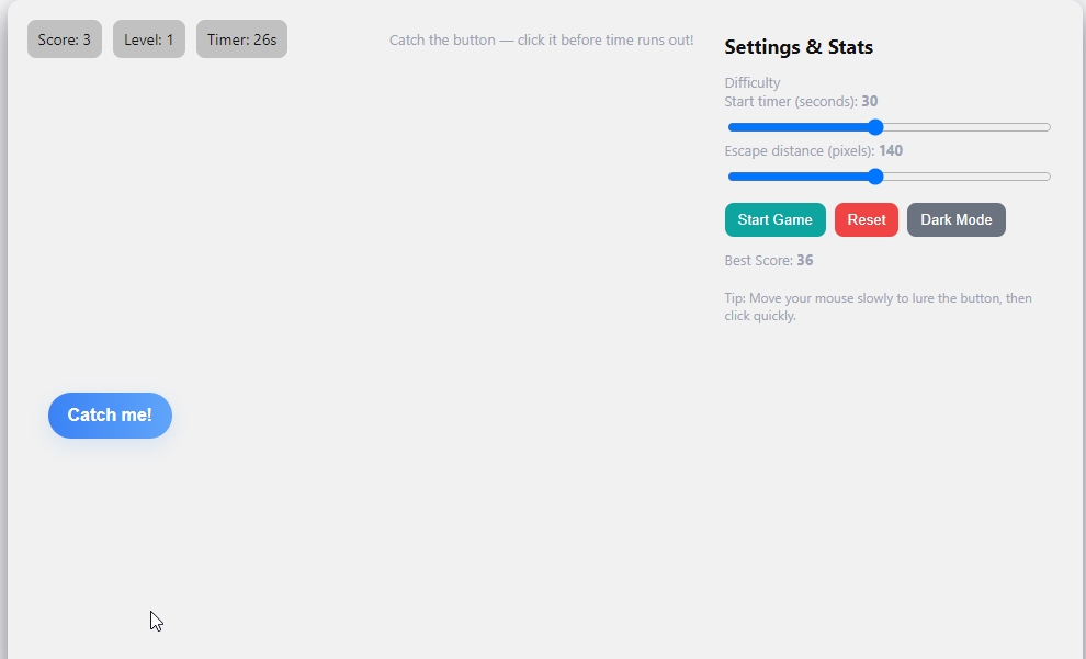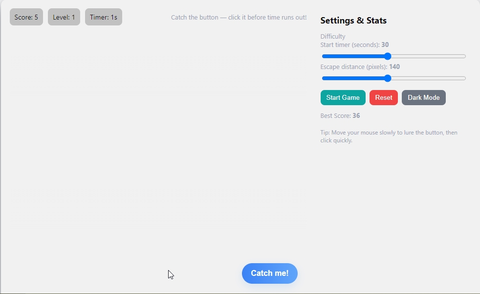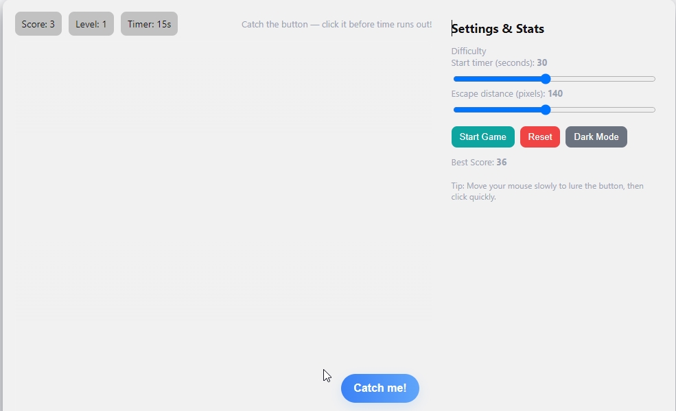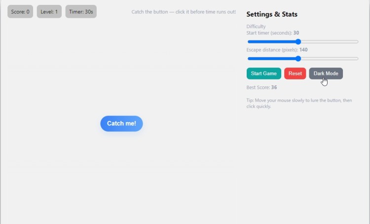 The Catch Me If You Can Game is an interactive web application built entirely with JavaScript. The gameplay is simple yet challenging — the objective is to click the button as quickly and as many times as possible before the time runs out. The Catch Me If You Can Game Using JavaScript offers a fun and engaging experience, with difficulty based on the configured speed and time. This project provides an excellent opportunity to practice and reinforce essential programming concepts while enhancing your JavaScript skills in game development.