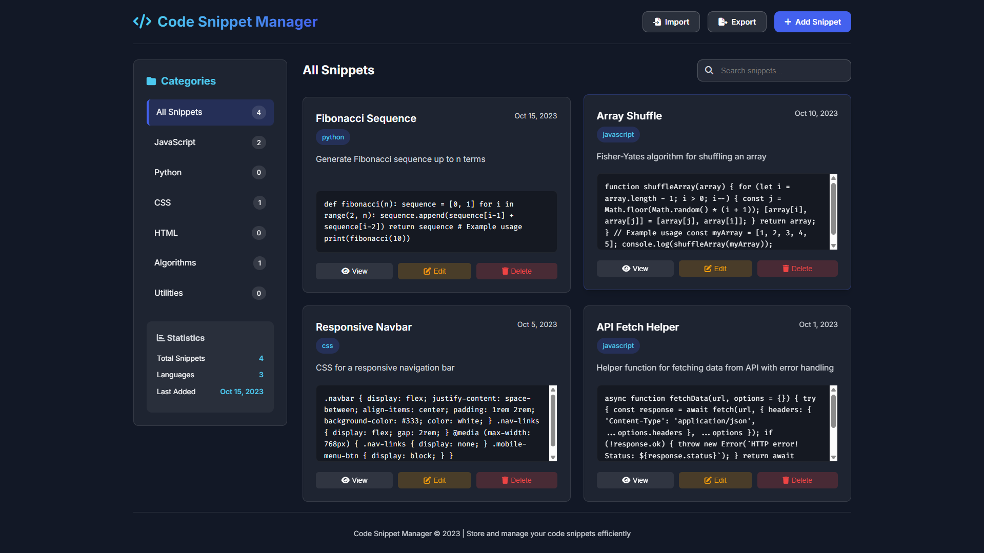 Built entirely with HTML, CSS, and vanilla JavaScript, this application demonstrates the power of front-end technologies to create full-featured, client-side tools. It runs directly in your browser with no backend requirements, storing all your snippets locally for security and immediate access. Whether you're a beginner collecting learning examples or a seasoned professional maintaining a utility library, this Code Snippet Manager provides an elegant and practical solution for keeping your valuable code organized and accessible whenever inspiration strikes.