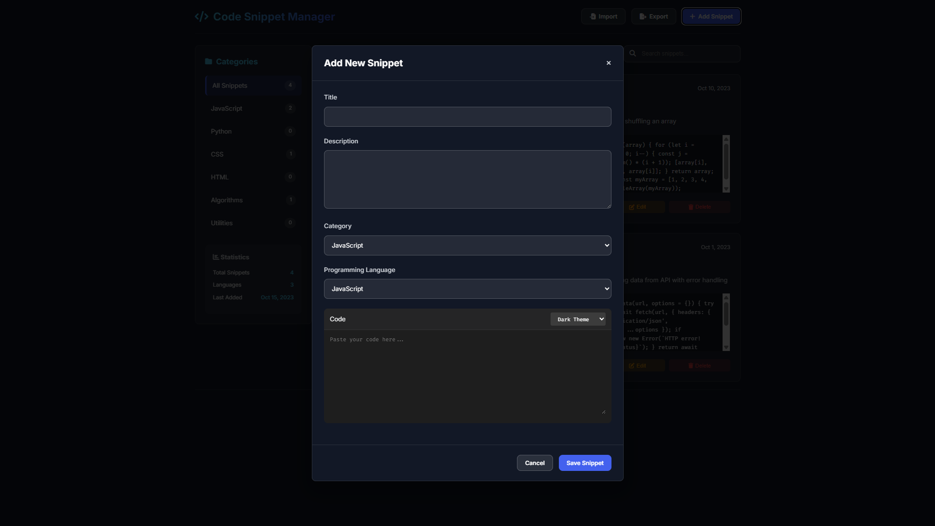 Adding Snippets: Click the "Add Snippet" button, fill in the title, description, select category and language, then paste your code