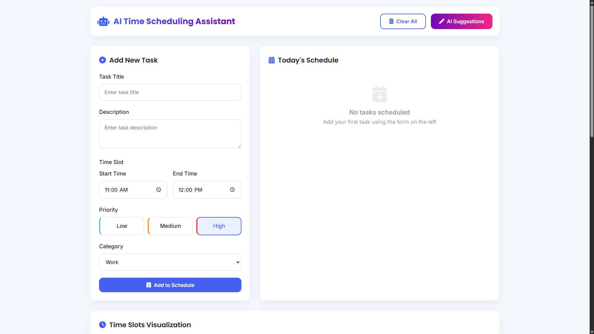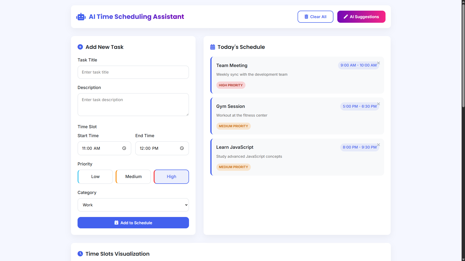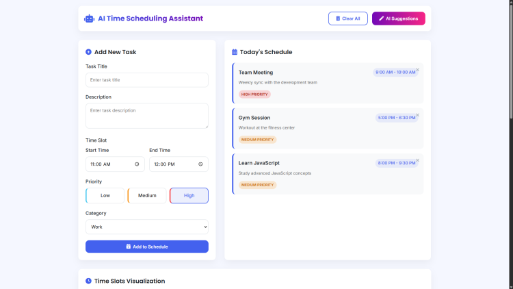 Developed entirely with HTML, CSS, and JavaScript, this front-end application delivers a smooth and responsive user experience across all devices. Users can easily create tasks with specific time ranges and priority levels, view them within a structured visual timeline, and receive data-based suggestions to improve schedule efficiency. Since the application runs directly in the browser without any backend or installation requirements, it provides an accessible and instant solution for anyone seeking better time management through intelligent automation.
