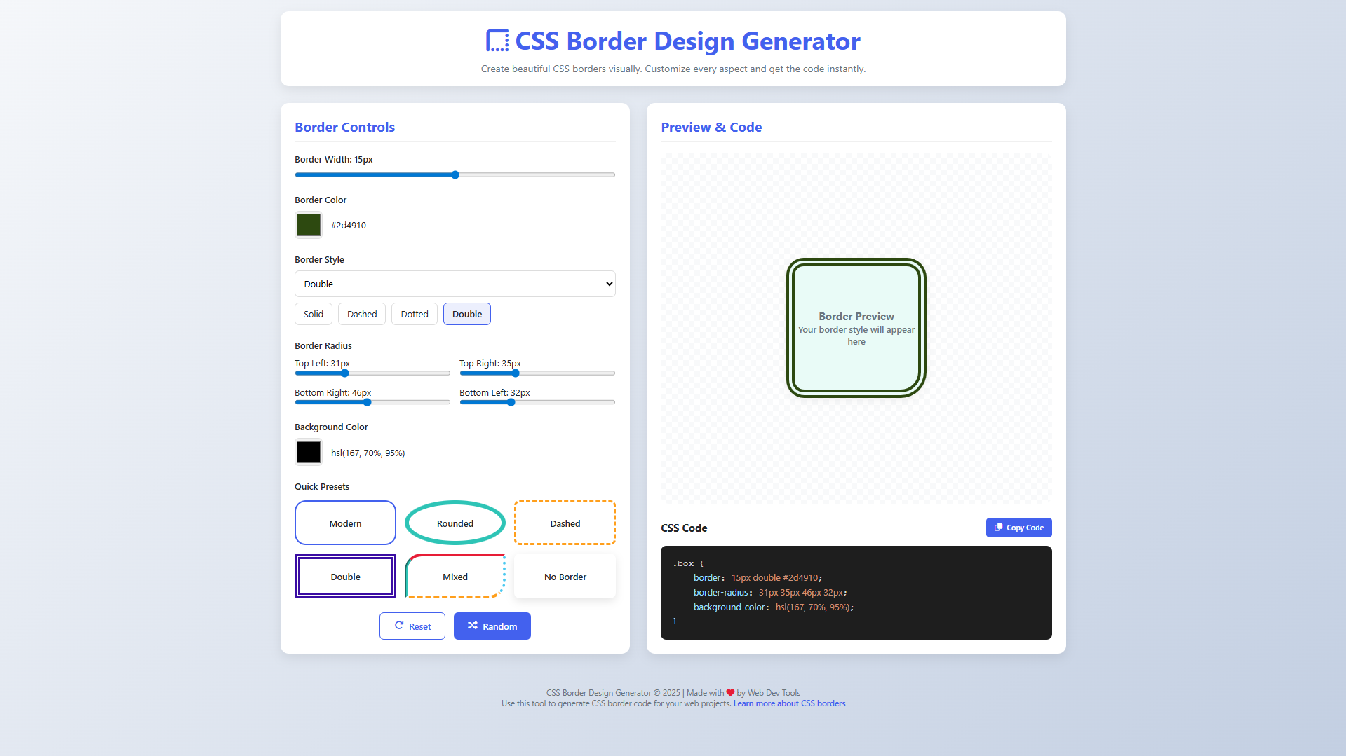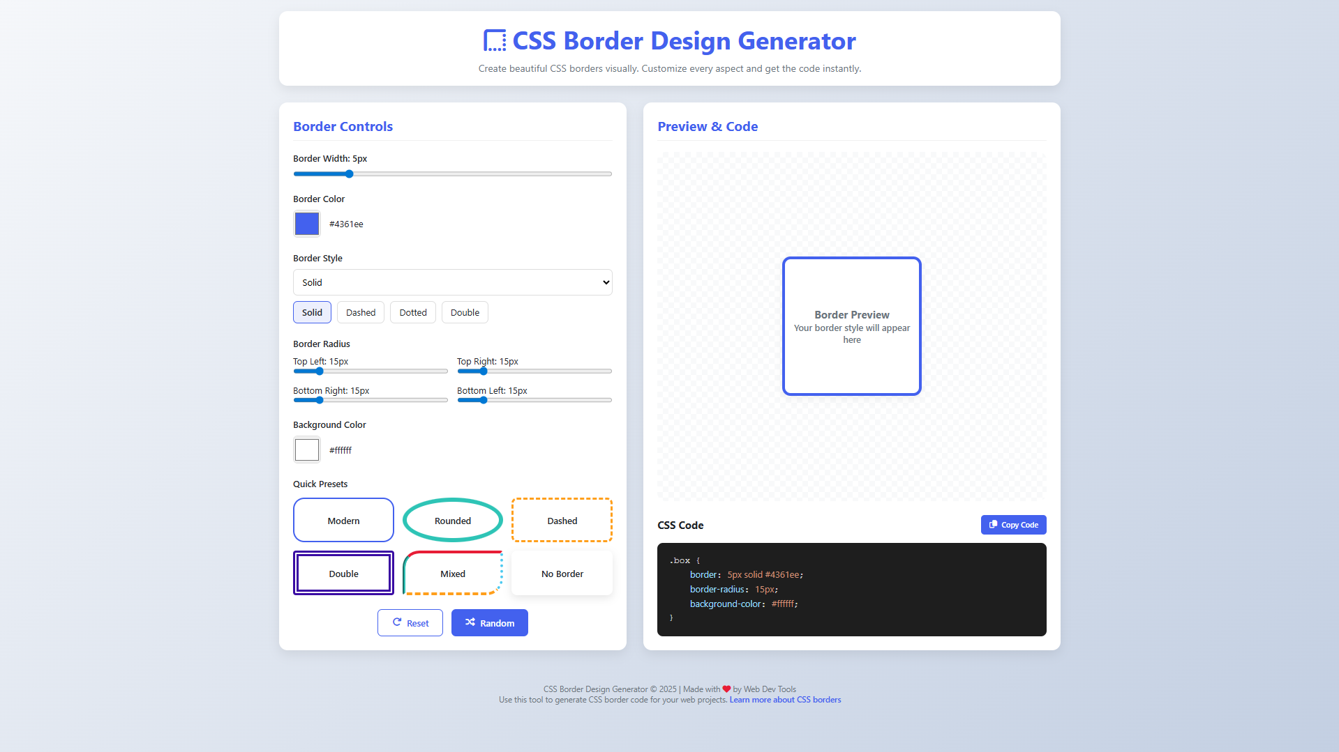 Built entirely with HTML, CSS, and JavaScript, this application combines modern web technologies to deliver a smooth and efficient user experience. With ready-made presets, a random generator for inspiration, and instant CSS code output, creating professional border designs becomes effortless. Simply tweak the intuitive controls, preview the changes live, and copy clean, production-ready CSS directly into your project. From beginners learning CSS fundamentals to experienced developers optimizing workflows, this tool serves as both a practical utility and an educational resource.