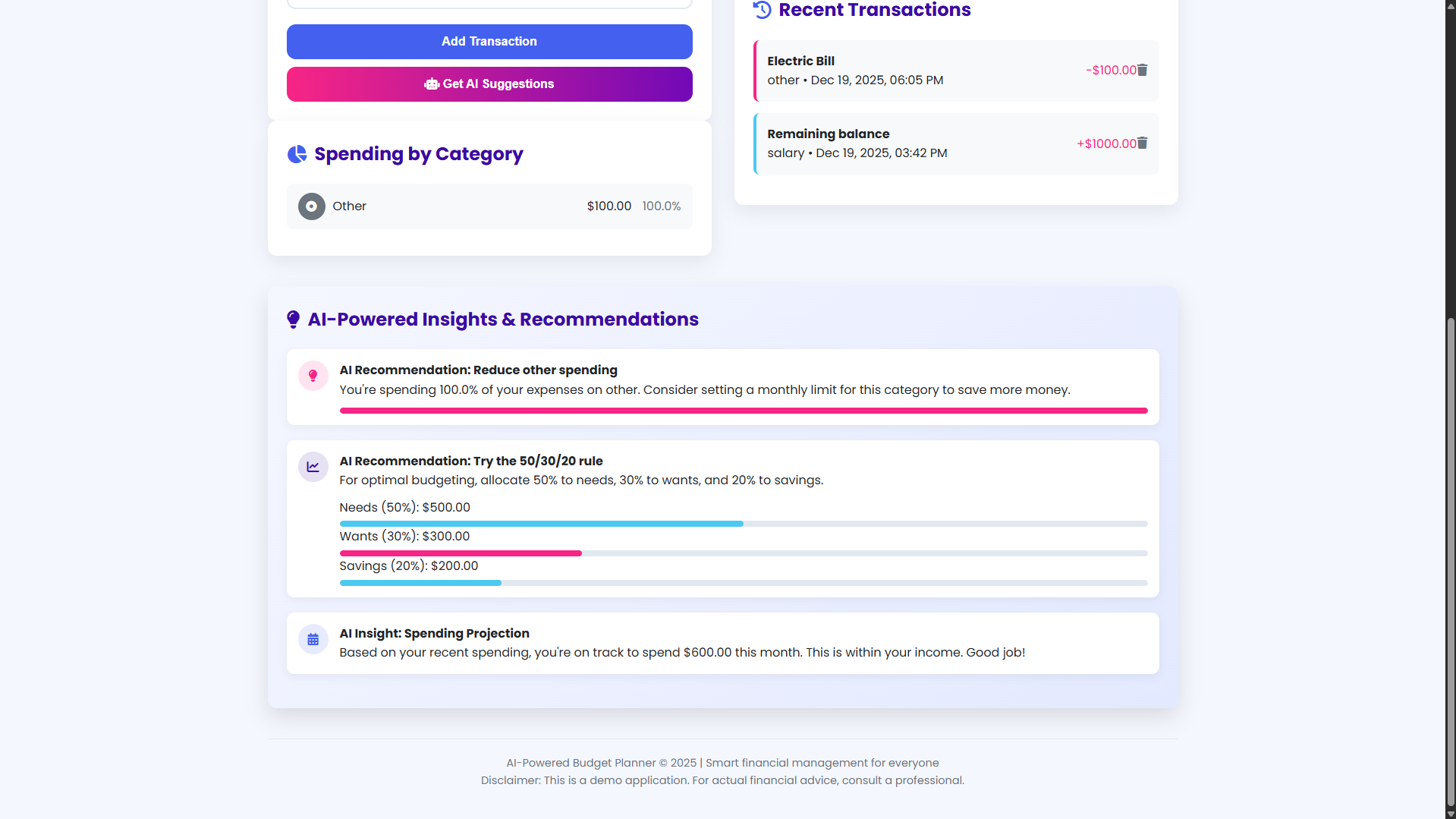 Built using HTML, CSS, and JavaScript, this application offers a comprehensive suite of features including category-based expense tracking, visual spending breakdowns, and AI-generated recommendations tailored to your financial patterns. Whether you're looking to save more, reduce unnecessary expenses, or simply gain better visibility into your cash flow, this budget planner provides the tools and intelligence to help you achieve your financial goals with confidence and clarity.