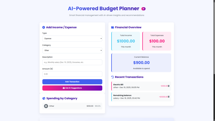 Welcome to the AI-Powered Budget Planner, a modern web application designed to transform how you manage your personal finances. This intuitive tool combines smart budgeting features with artificial intelligence insights to help you track income, monitor expenses, and make informed financial decisions. With its clean, responsive interface and real-time calculations, you can easily visualize your financial health and maintain control over your spending habits, all within a single, accessible platform.