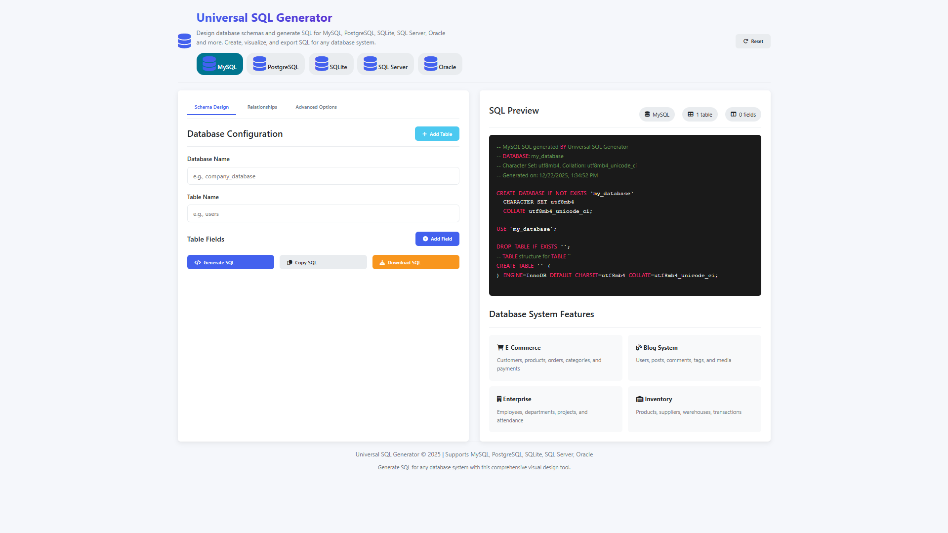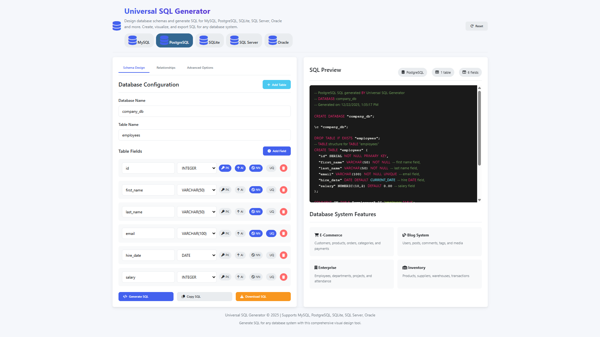 Welcome to the Universal SQL Generator, a powerful web-based application that revolutionizes how database schemas are designed and implemented across multiple database platforms. This innovative tool provides a unified visual interface for creating comprehensive database structures that can be exported to MySQL, PostgreSQL, SQLite, SQL Server, and Oracle with platform-specific optimizations and proper syntax. By eliminating the need to learn the nuanced differences between database systems, this application empowers developers, database administrators, and students to focus on logical database design while automatically generating production-ready SQL code tailored to their chosen platform. Whether you're prototyping a new application, migrating between database systems, or learning database concepts, this tool bridges the gap between conceptual design and technical implementation.