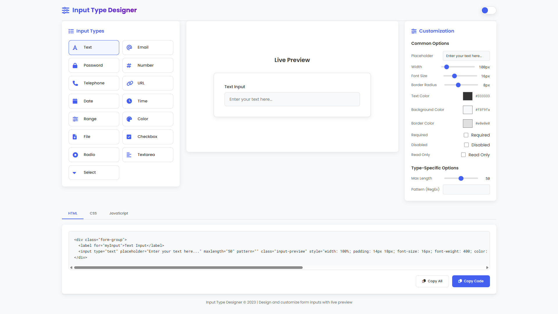 Welcome to the Input Type Designer, an innovative web application built with HTML, CSS, and JavaScript that revolutionizes how you create and customize form inputs. This powerful tool provides a visual, interactive environment where you can design, style, and configure various HTML input elements with real-time feedback. Whether you're a beginner learning web development or an experienced developer looking to streamline your workflow, this application offers an intuitive interface to experiment with different input types, adjust their appearance, and instantly generate clean, production-ready code for your projects.