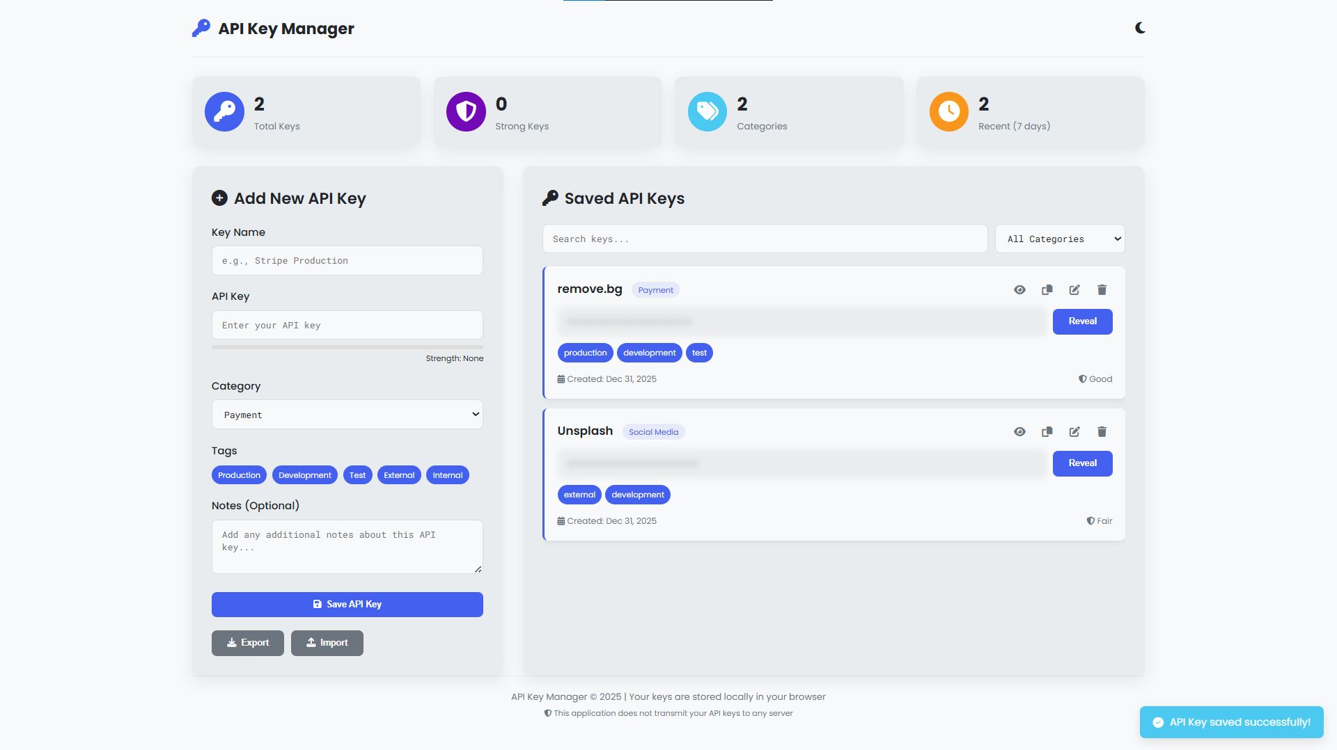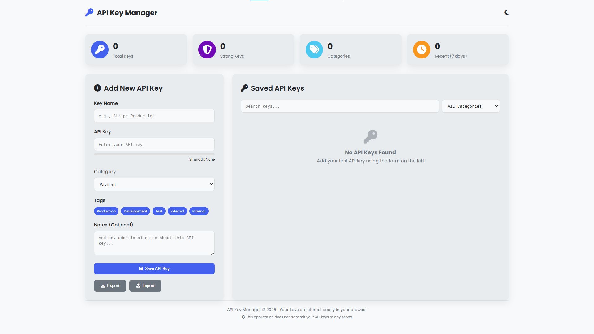 Welcome to the API Key Manager, a modern web application designed to help developers securely organize and manage their API credentials. Built entirely with HTML, CSS, and JavaScript, this tool provides a clean, intuitive interface for storing, categorizing, and protecting your API keys locally within your browser. With no server transmission required, your sensitive data remains private and secure, giving you complete control over your credentials while offering powerful organization features that streamline your development workflow.