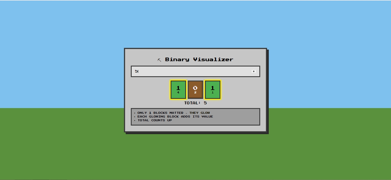 Binary Visualizer App Using JavaScript – This interactive web app allows users to explore and understand binary numbers in a visually engaging way. Users can input any decimal number, and the app dynamically converts it into binary, representing each bit as a glowing block. Each block highlights its value when active, and the total number is calculated step by step, helping users see exactly how binary addition works. The app’s subtle animations make the conversion process feel like stacking blocks, adding a fun, game-like experience to learning. Perfect for students, educators, and anyone curious about how computers interpret numbers, this tool makes the concept of binary simple, interactive, and intuitive.