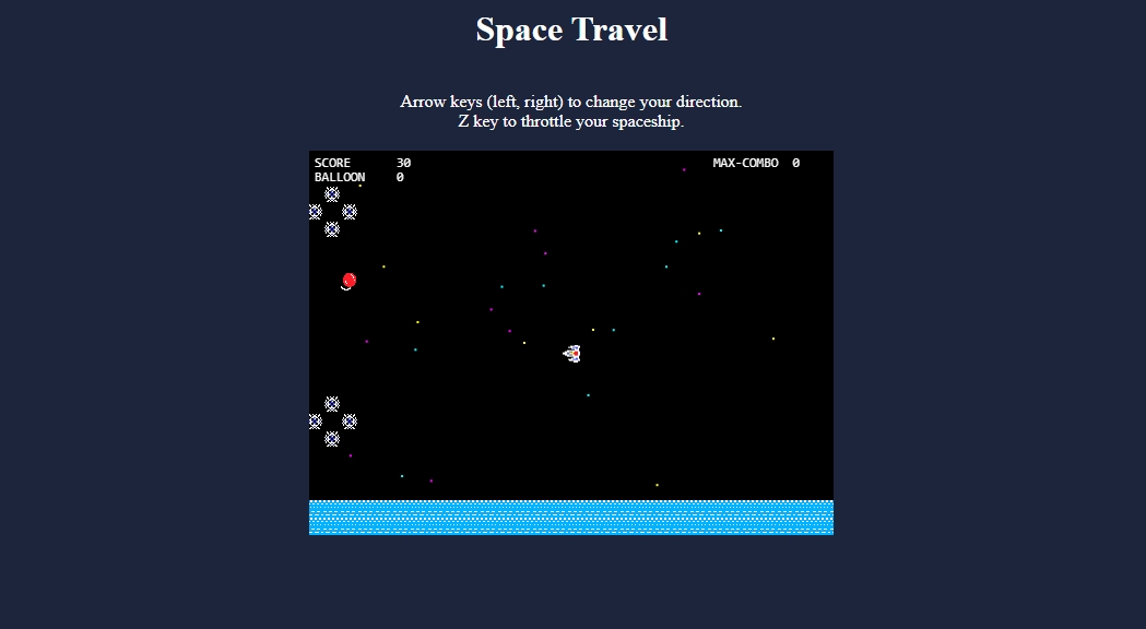 The Space Travel Game is an interactive web application built entirely with JavaScript. The gameplay is simple: the player must travel through space, collecting balloons to earn bonus points while avoiding obstacle mines. The Space Travel Game Using JavaScript offers a fun and engaging experience where players must carefully navigate, collect balloons, and avoid dangerous obstacles. This project provides an excellent opportunity to practice and reinforce essential programming concepts while enhancing your JavaScript skills in game development.