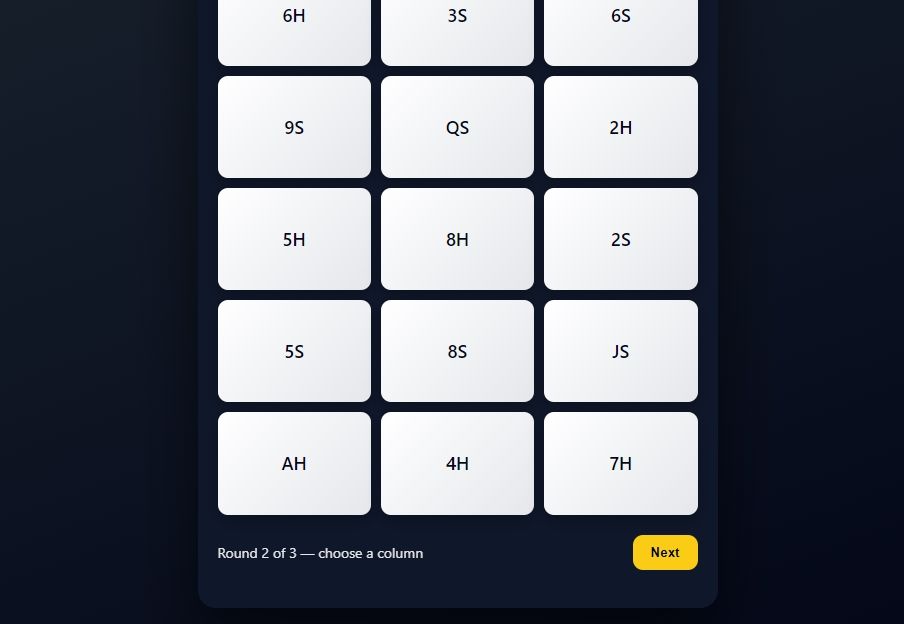 - Buttons for starting the trick, selecting columns, and revealing the card.