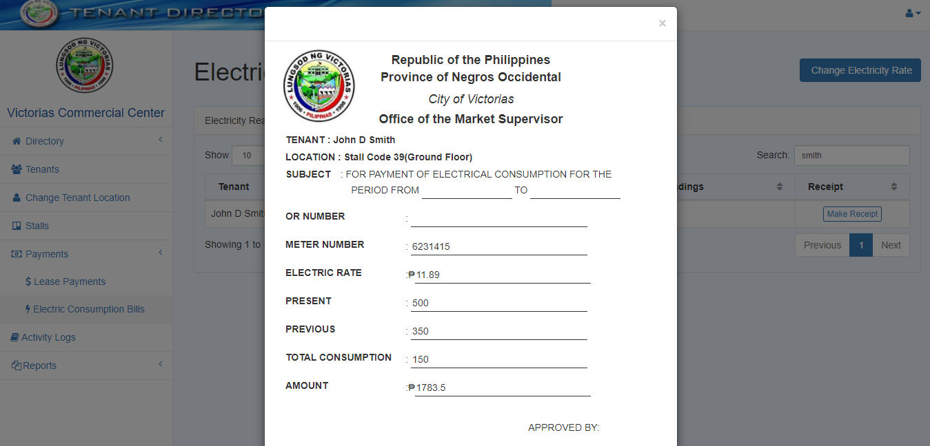 - The system generates several reports such as the active and inactive tenants, the tenant's previous and current stall location, and the monthly lease payments and electric consumption. The activity log is also established to track all the transactions made by the user.