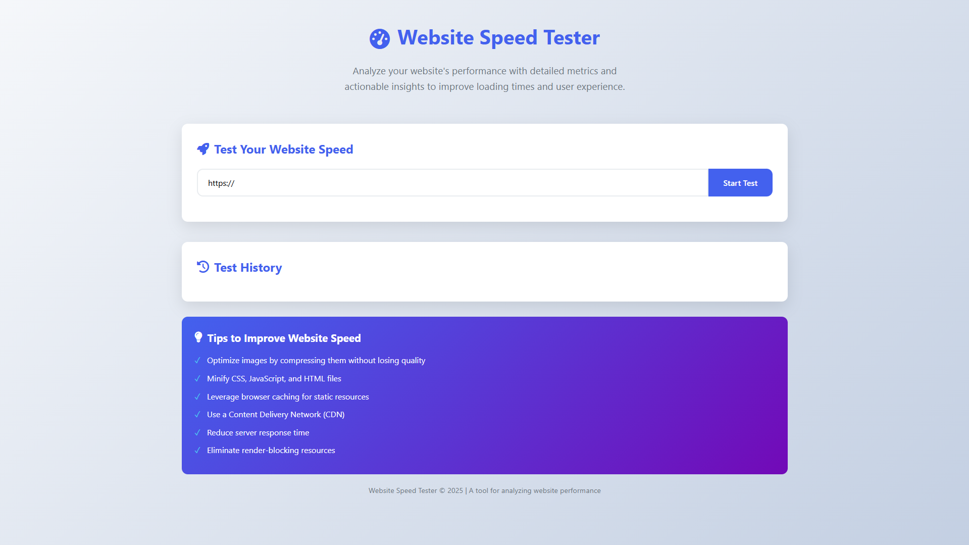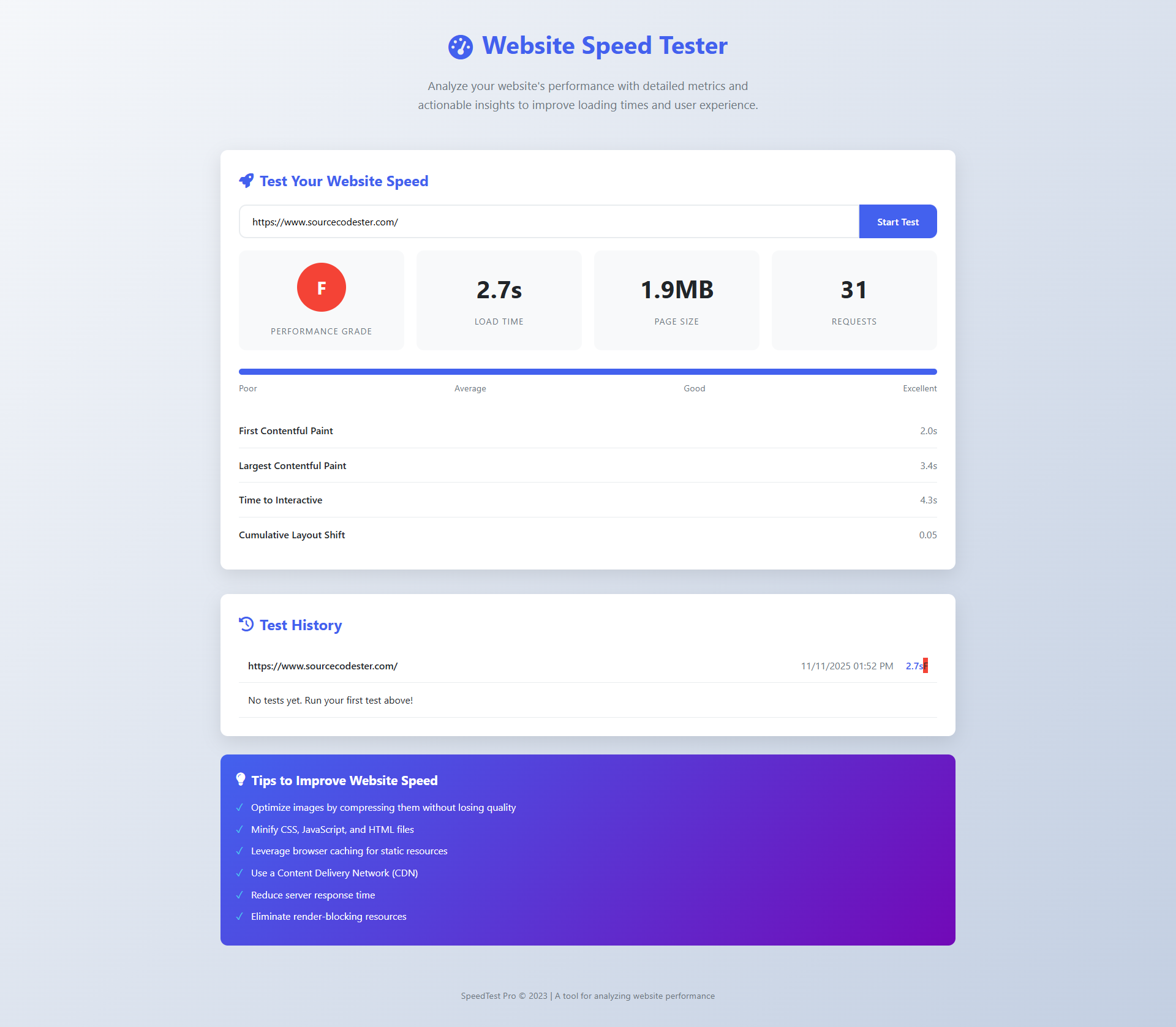 Our application combines the power of PHP backend processing with sophisticated JavaScript frontend interactions to deliver accurate, real-time performance metrics in an intuitive, user-friendly interface. Beyond simple load time measurements, we offer detailed analysis of Core Web Vitals, resource utilization, and performance benchmarks that matter most to your visitors and search engines. Whether you're launching a new site or optimizing an existing one, our tool empowers you with the knowledge and actionable recommendations needed to create blazing-fast web experiences that keep users engaged and coming back for more.